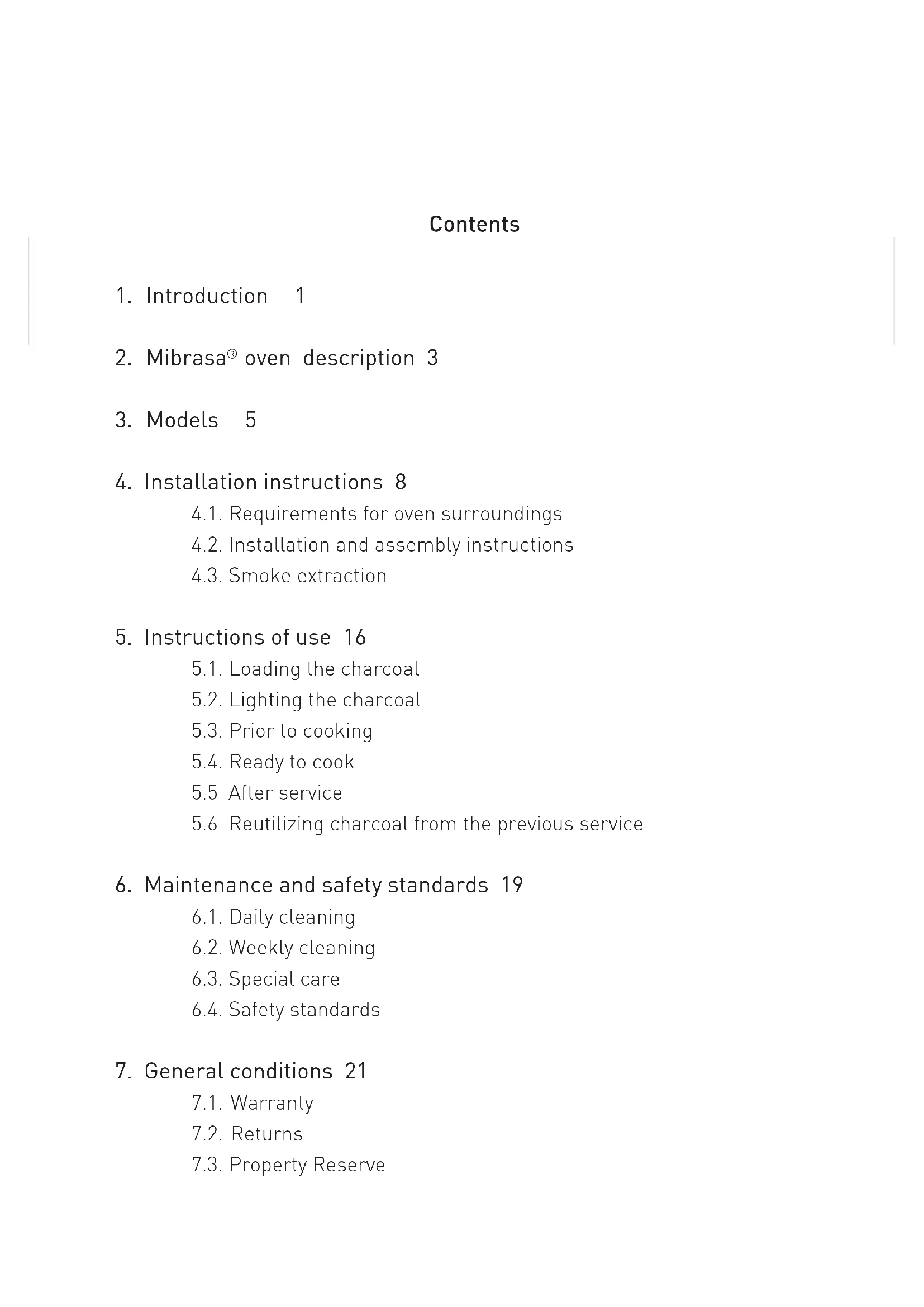 Place back the frontal panel Follow the steps for models with cupboard below Option 1 Option 213 4.3. Smoke extraction When the oven is installed in the interior of a closed building an hood extract of sufcient dimensions is required. The hood extract must have a suitable depth in order to cover the opening of the oven and stand out laterally by 5.9”on both sides. Installation of the exhaust hood in accordance with the standard NFPA 96. Dissipating filter: This is installed over the rebreak. It lters and spreads the ow of air, slowing it down and dropping its tem- perature. To guarantee the correct operation of the said components, the recommended charcoal loads mentioned in point 5.1 should be respected. Firebreak: Is installed where the smoke leaves the oven. Its function is to prevent ames or sparks from escaping the oven. MIBRASA