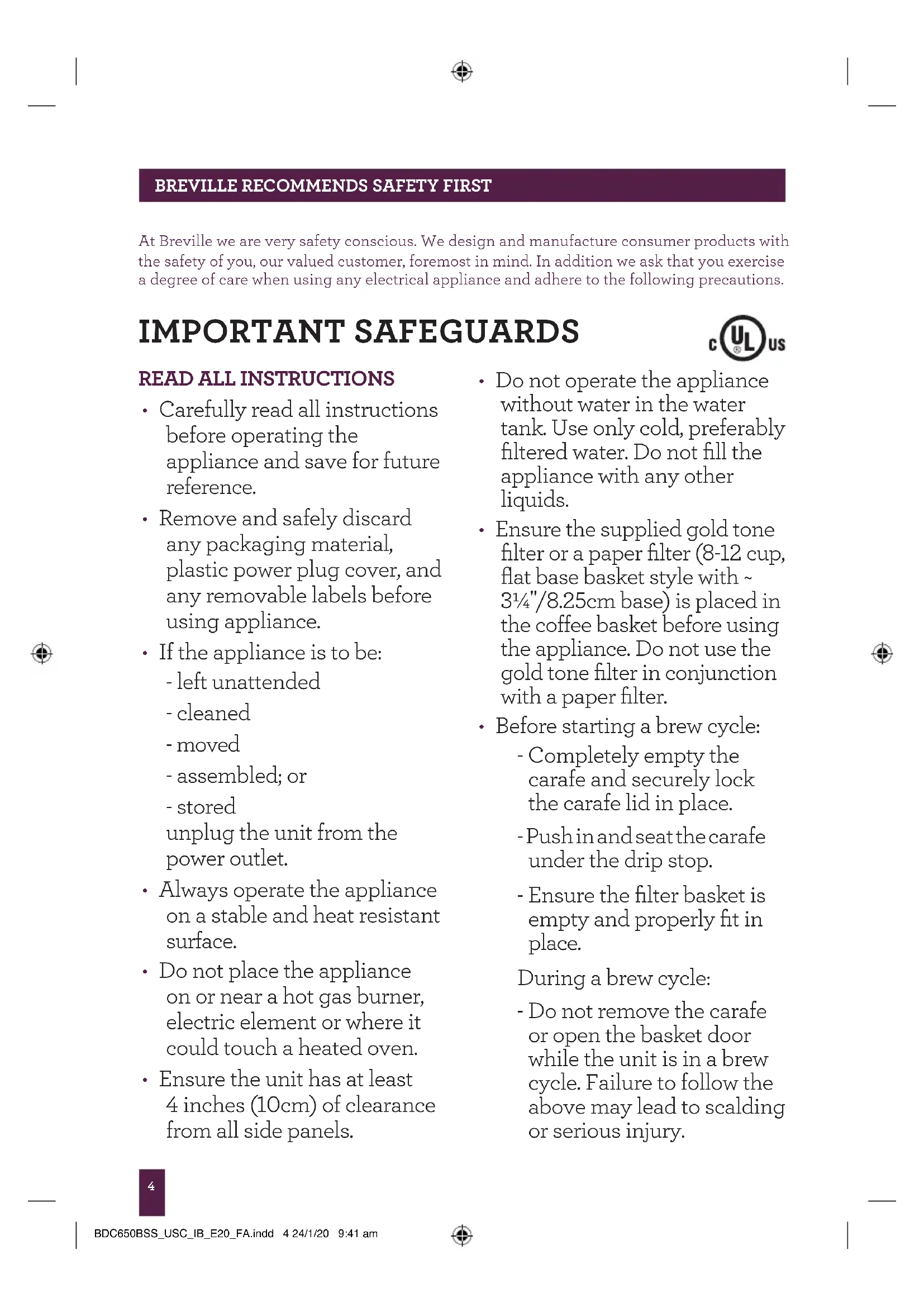 - Before starting a brew cycle: - Completely empty the carafe and securely lock the carafe lid in place. - Push in and seat the carafe under the drip stop. - Ensure the filter basket is empty and properly fit in place. During a brew cycle: - Do not remove the carafe or open the basket door while the unit is in a brew cycle. Failure to follow the above may lead to scalding or serious injury. IMPORTANT SAFEGUARDS BDC650BSS_USC_IB_E20_FA.indd 4 24/1/20 9:41 am5 BREVILLE RECOMMENDS SAFETY FIRSTBREVILLE RECOMMENDS SAFETY FIRSTBREVILLE RECOMMENDS SAFETY FIRST