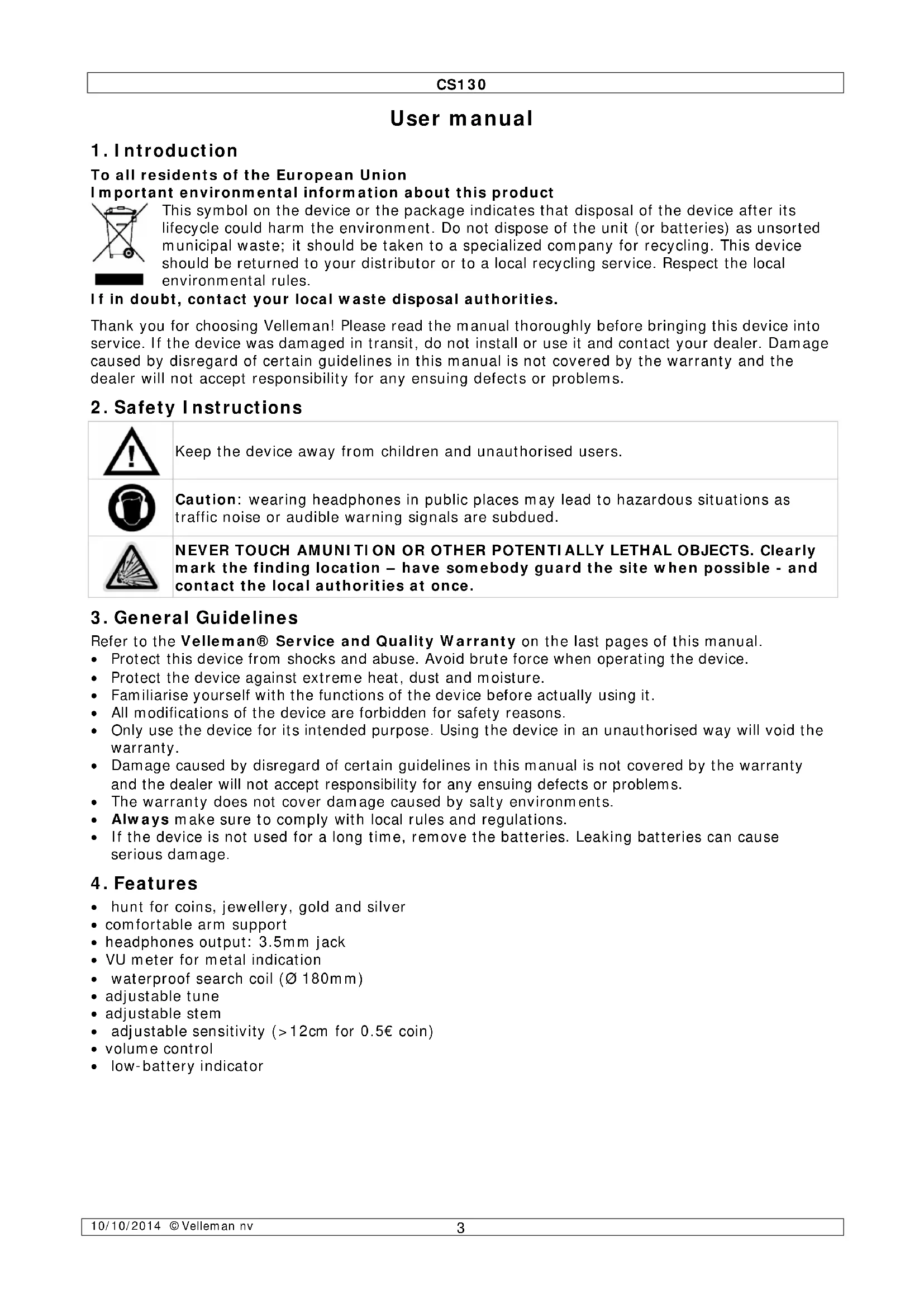 The information in this manual is subject to change without prior notice. © COPYRIGHT NOTICE The copyright to this manual is owned by Velleman nv. All worldwide rights reserved. No part of this manual or may be copied, reproduced, translated or reduced to any electronic medium or otherwise without the prior written consent of the copyright holder.CS130 10/10/2014 © Velleman nv