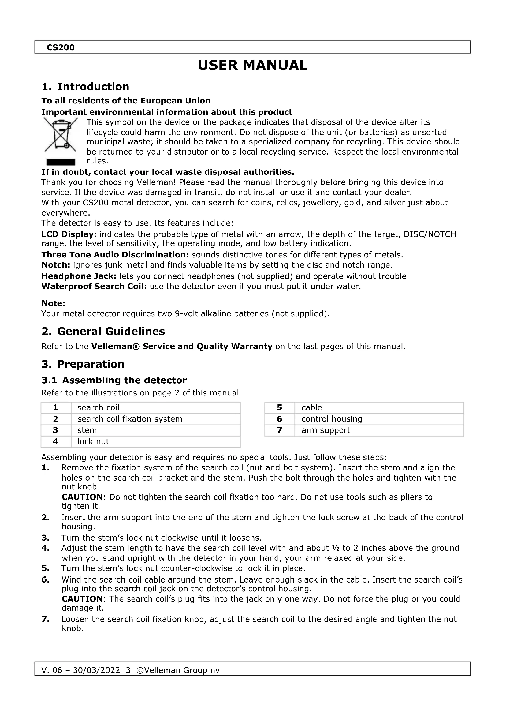 To all residents of the European Union Important environmental information about this product This symbol on the device or the package indicates that disposal of the device after its lifecycle could harm the environment. Do not dispose of the unit (or batteries) as unsorted municipal waste; it should be taken to a specialized company for recycling. This device should be returned to your distributor or to a local recycling service. Respect the local environmental rules. If in doubt, contact your local waste disposal authorities. Thank you for choosing Velleman! Please read the manual thoroughly before bringing this device into service. If the device was damaged in transit, do not install or use it and contact your dealer. With your CS200 metal detector, you can search for coins, relics, jewellery, gold, and silver just about everywhere. The detector is easy to use. Its features include: LCD Display: indicates the probable type of metal with an arrow, the depth of the target, DISC/NOTCH range, the level of sensitivity, the operating mode, and low battery indication. Three Tone Audio Discrimination: sounds distinctive tones for different types of metals. Notch: ignores junk metal and finds valuable items by setting the disc and notch range. Headphone Jack: lets you connect headphones (not supplied) and operate without trouble Waterproof Search Coil: use the detector even if you must put it under water. Note: Your metal detector requires two 9-volt alkaline batteries (not supplied).