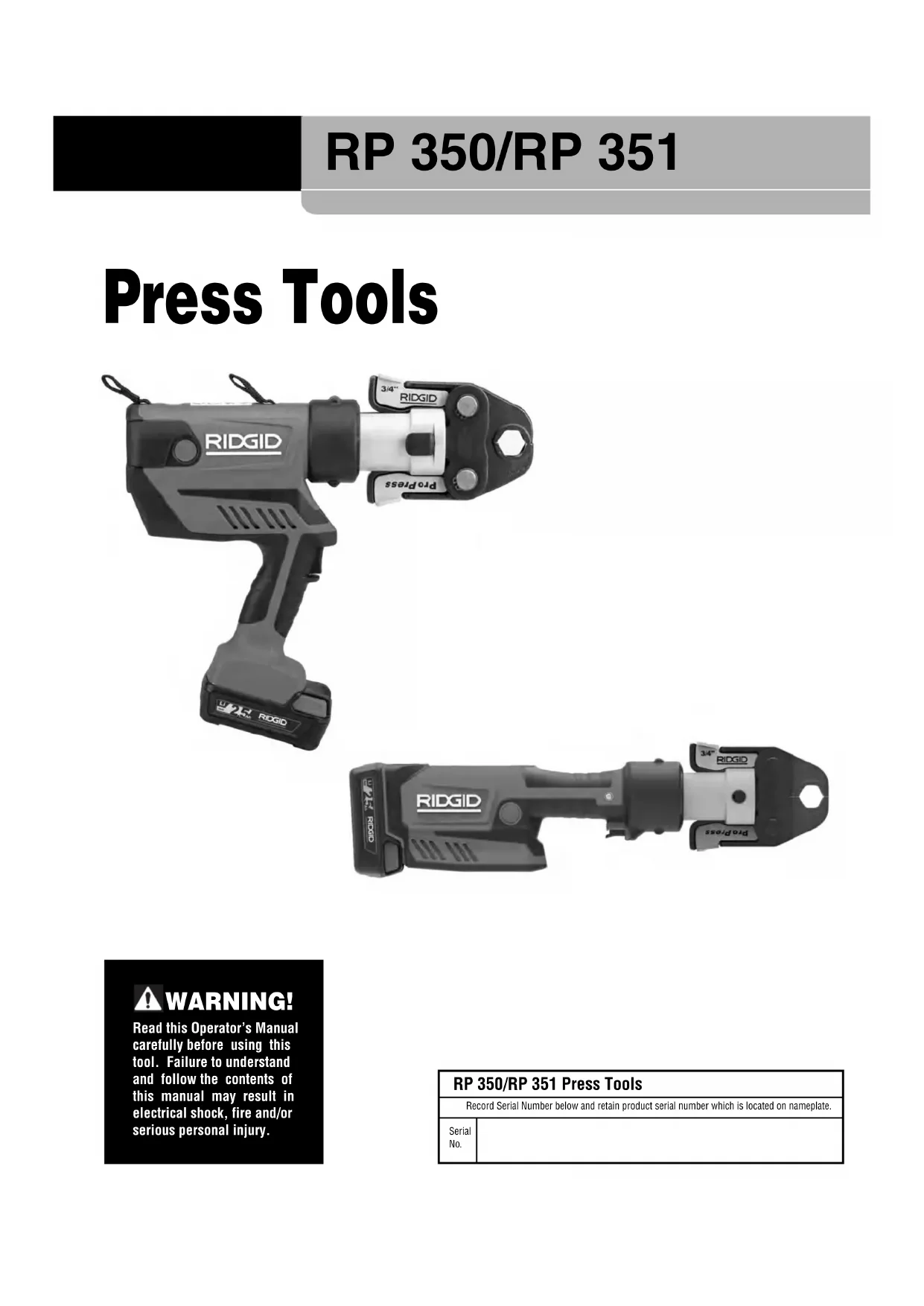 RP 350/RP 351 Press Tools General Power Tool Safety Warnings* WARNING Read all safety warnings, instructions, illustrations and specifications provided with this power tool. Failure to follow all instructions listed below may result in electric shock, fire and/or serious injury.
