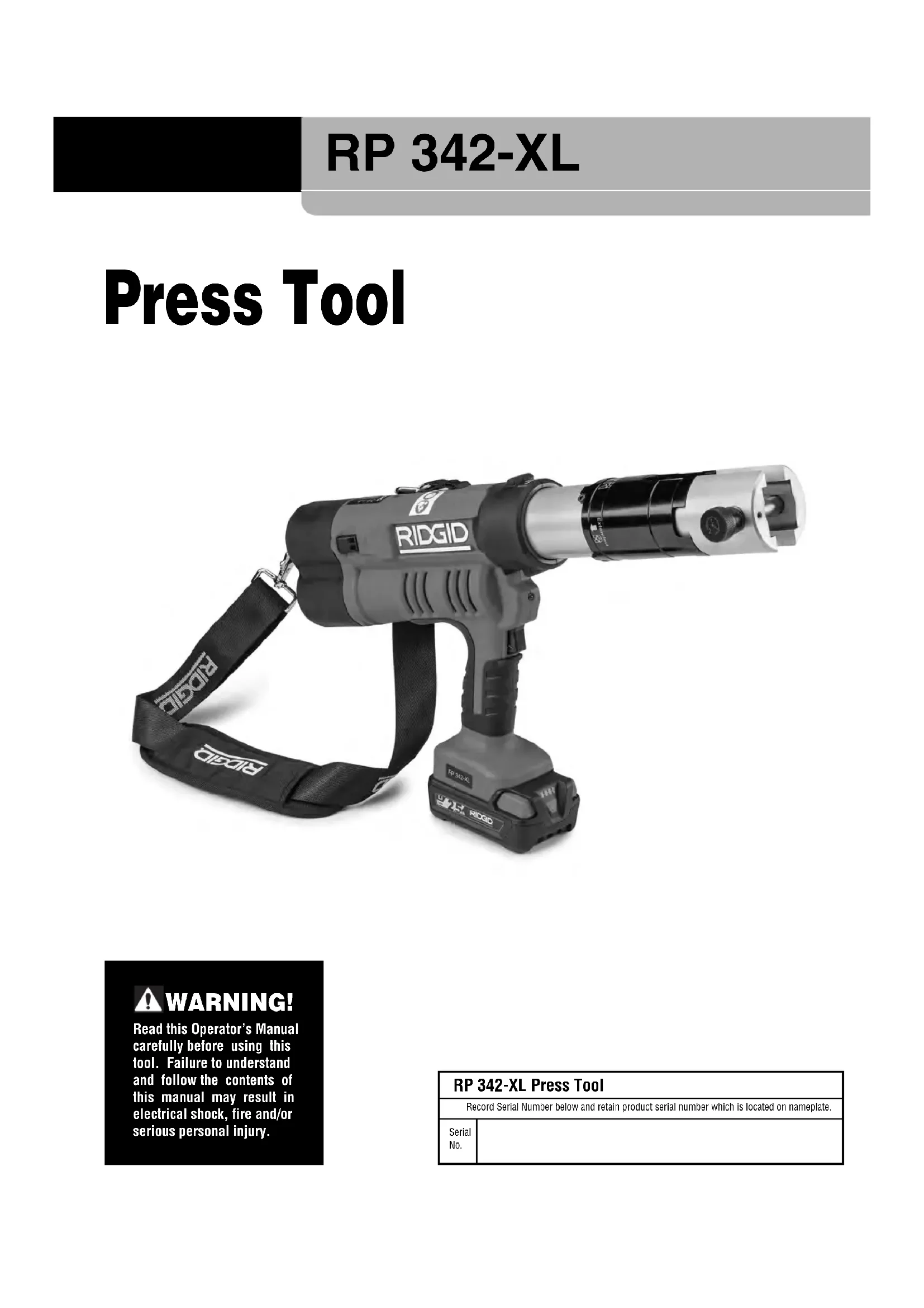 Attachments should open and close freely with only moderate finger effort required. Required Maintenance By RIDGID Authorized Independent Service Center The RP 342-XL Press Tool must be serviced at set intervals by a RIDGID Authorized Independent Service Center to ensure proper operation. This will be indicated by a tool sta- tus light (See Figure 5). Service And Repair WARNING Improper service or repair can make machine unsafe to operate. Service and repair on the RP 342-XL Press Tool must be performed by a RIDGID Authorized Independent Press Tool Service Center. For information on your nearest RIDGID Authorized Independent Service Center or any service or repair ques- tions see Contact Information section in this manual. WARNINGOptional Equipment WARNING To reduce the risk of serious injury, only use equip-ment specifically designed and recommended foruse with the RIDGID RP 342-XL Press Tool, such aslisted below. Ridge Tool Company provides Standard series press attachments designed specifically for use with RIDGID Standard Press Tools. Only use attachments that are specifically designed to press the fitting system you are installing. For a complete listing of RIDGID equipment available for these tools, see the Ridge Tool Catalog online at RIDGID.com or see Contact Information. Disposal Parts of these tools contain valuable materials and can be recycled. There are companies that specialize in recycling that may be found locally. Dispose of the components in compliance with all applicable regulations. Contact your local waste management authority for more information. For EC Countries: Do not dispose of elec- trical equipment with household waste! According to the European Guideline 2012/ - 19/ EU for Waste Electrical and Electronic Equipment and its implemen tation into nation- al legislation, electrical equipment that is no longer usable must be collected separately and disposed of in an environmentally correct manner.