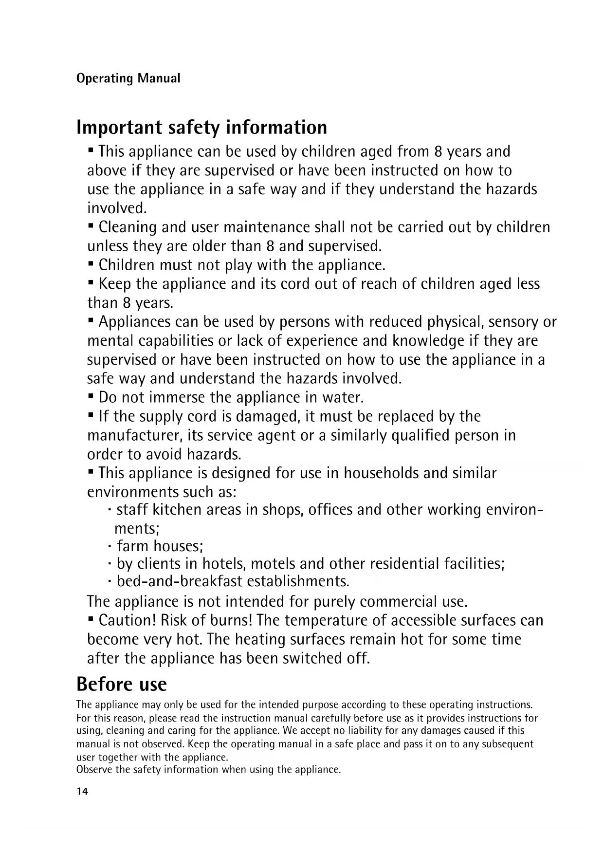 - Caution! Risk of burns! The temperature of accessible surfaces can become very hot. The heating surfaces remain hot for some time after the appliance has been switched off. Before use The appliance may only be used for the intended purpose according to these operating instructions. For this reason, please read the instruction manual carefully before use as it provides instructions for using, cleaning and caring for the appliance. We accept no liability for any damages caused if this manual is not observed. Keep the operating manual in a safe place and pass it on to any subsequent user together with the appliance. Observe the safety information when using the appliance.15 enen Technical data Rated voltage: 220–240 V~ 50–60 Hz Power consumption: 900 W Protection class: I Additional safety information