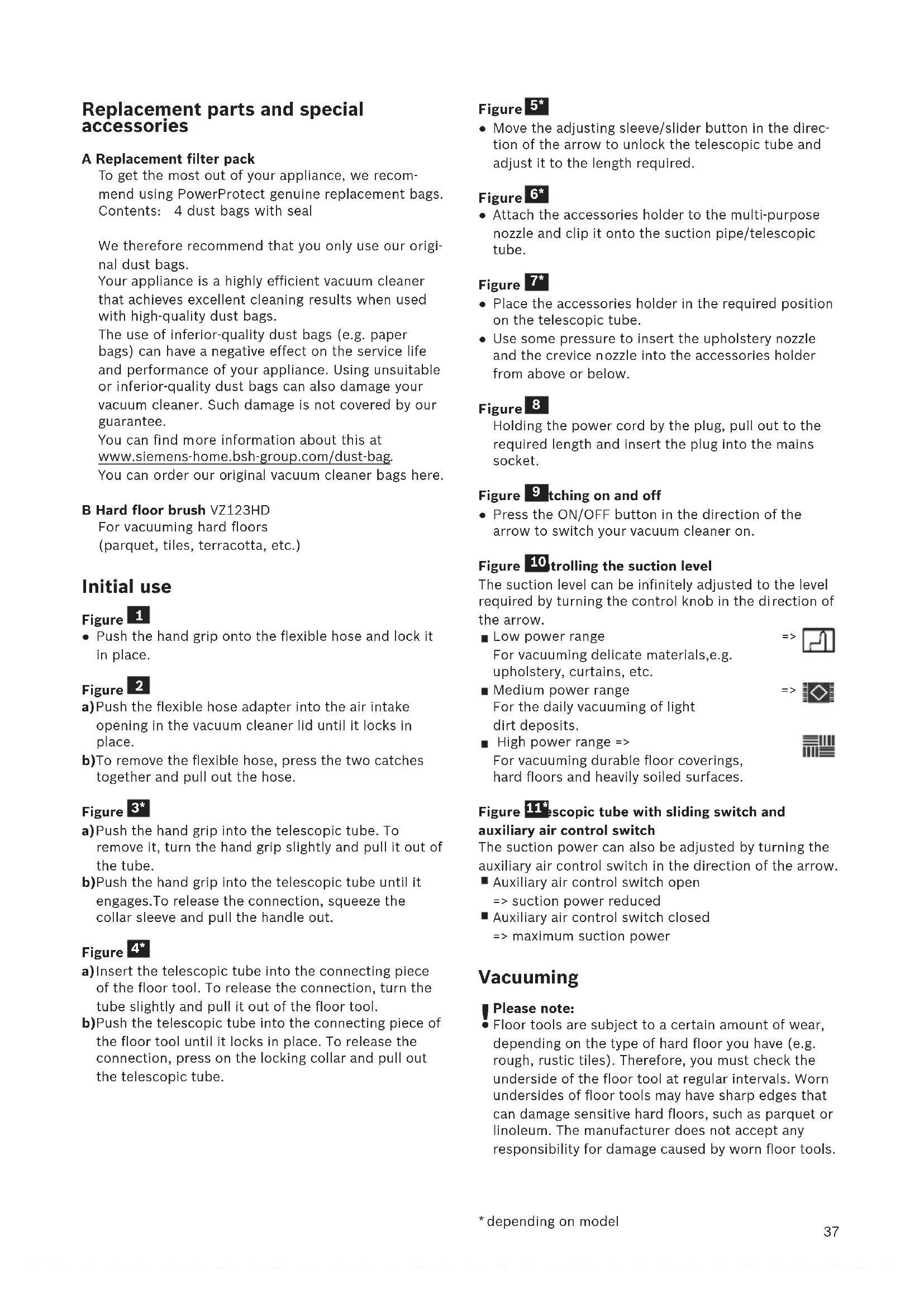 You can order our original vacuum cleaner bags here. B Hard floor brush VZ123HD For vacuuming hard floors (parquet, tiles, terracotta, etc.) Initial use Figure ● Push the hand grip onto the flexible hose and lock it in place. Figure a)Push the flexible hose adapter into the air intake opening in the vacuum cleaner lid until it locks in place. b)To remove the flexible hose, press the two catches together and pull out the hose. Figure a)Push the hand grip into the telescopic tube. To remove it, turn the hand grip slightly and pull it out of the tube. b)Push the hand grip into the telescopic tube u ntil it engages.To release the connection, squeeze the collar sleeve and pull the handle out. Figure a)Insert the telescopic tube into the connecting piece of the floor tool. To release the connection, turn the tube slightly and pull it out of the floor tool. b)Push the telescopic tube into the connecting piece of the floor tool until it locks in place. To release the connection, press on the locking collar and pull out the telescopic tube.