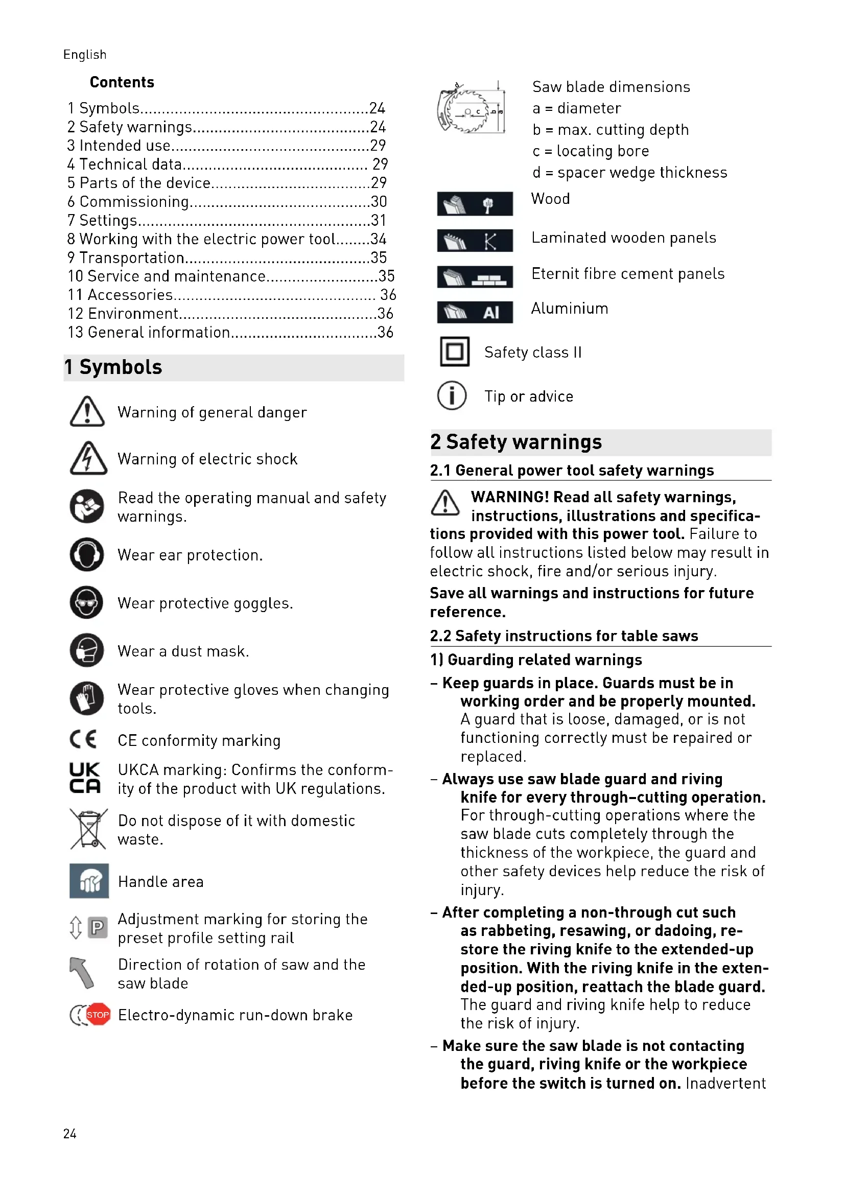 Saw blade dimensions a = diameter b = max. cutting depth c = locating bore d = spacer wedge thickness Wood Laminated wooden panels Eternit fibre cement panels Aluminium Safety class II Tip or advice 2 Safety warnings