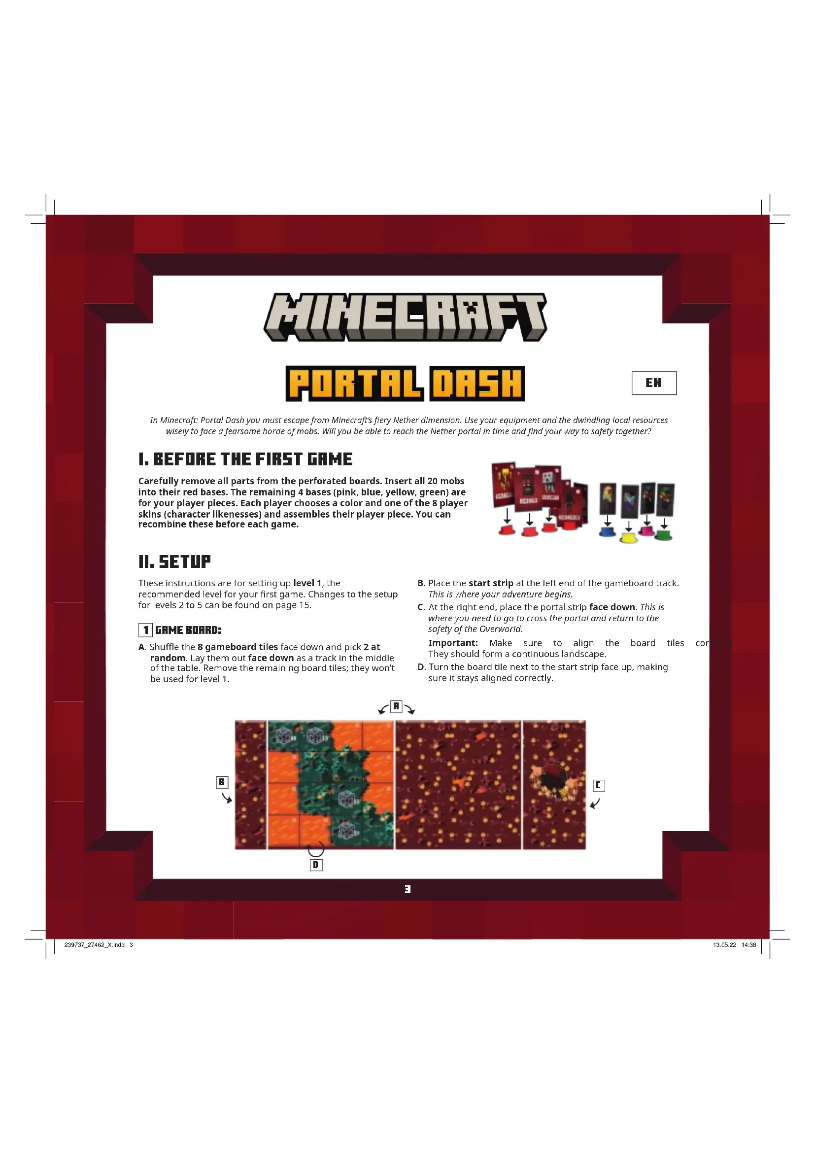 Magma cubes These weak mobs have 2 life. When they are activated, they move up to 2 spaces and attack an adjacent player for 2 damage. Ghasts These ying mobs have 2 life. When they are activated, they move 1 space. They can move onto lava spaces. If they are within attack range (2 spaces), they attack that player for 2 damage. Important: Ghasts cannot be fought with a sword, they are too high up in the air! Endermen The tall Endermen have 3 life. When they are activated, they move up to 5 spaces and attack an adjacent player for 2 damage. Important: Endermen cannot be fought with a bow; they are too nimble and will dodge your arrows! Hoglins Hoglins are tough. They have 4 life. When they are activated, they move up to 3 spaces and attack an adjacent player for 2 damage. When they deal damage, they “push” that player onto an adjacent space that is not occupied by a mob. You choose which space that player is pushed onto. If it’s a magma space, that player is dealt an additional 1 damage. If that player is completely surrounded by mobs and/or lava spaces, they are not pushed and remain where they are. Blazes Blazes are creatures of re. They have 4 life and they don’t move. When they are activated, they attack and deal 2 damage to all player pieces within range (2 spaces). Avoid standing too close, and especially not in a group! Run past them as quickly as you can, then they pose no danger. Wither skeletons The sinister wither skeletons have 4 life. When they are activated, they move up to 2 spaces and attack an adjacent player for 2 damage. Additionally, their attack damages 1 item in that player’s inventory! If you are dealt damage by a wither skeleton, move an item of your choice to the bottom row of your inventory. You won’t be able to use its action until you have repaired it. If you move a piece of armor, remove all hearts from it. If you have only damaged items in your inventory, nothing happens. 239737_27462_X.indd 16239737_27462_X.indd 16 13.05.22 14:3913.05.22 14:3917 End boss: The Wildfire This hot-headed creature can cross lava and will attack you from a distance. Depending on the rolled number, it will use the following attacks: Easy mode (20 life): The Wildre moves up to 2 spaces. It can move onto lava spaces. Then it deals 1 damage to a player within range (3 spaces). The Wildre moves up to 2 spaces. It can move onto lava spaces. Then it deals 2 damage to a player within range (3 spaces). The Wildre moves up to 2 spaces. It can move onto lava spaces. Then it deals 3 damage to a player within range (3 spaces). Hard mode (25 life): The Wildre moves up to 2 spaces. It can move onto lava spaces. Then it deals 1 damage to all players within range (3 spaces). The Wildre moves up to 2 spaces. It can move onto lava spaces. Then it deals 2 damage to a player within range (3 spaces). Additionally, it damages 1 item in the attacked player’s inventory. Move 1 item of your choice to the bottom row of your inventory. You won’t be able to use its action until you have repaired it. If you move a piece of armor, remove all hearts from it. If you have only damaged items in your inventory, nothing happens. The Wildre moves up to 2 spaces. It can move onto lava spaces. Then it deals 3 damage to a player within range (3 spaces). Additionally, you must remove 1 block of any color from the top layer of the resource cube. Use the same rules as if you rolled a with the blocks die. End boss: The Ancient Hoglin This fearsome beast charges you and attacks you with great force. Depending on the rolled number, it will use the following attacks: Easy mode (20 life): The Ancient Hoglin moves up to 3 spaces. Then it deals 2 damage to an adjacent player. The Ancient Hoglin moves up to 3 spaces. Then it deals 3 damage to an adjacent player. The Ancient Hoglin moves up to 3 spaces. Then it deals 4 damage to an adjacent player. Hard mode (25 life): The Ancient Hoglin moves up to 3 spaces. Then it deals 2 damage to an adjacent player. This special attack cannot be blocked by armor! If you are hit, you must remove heart tokens directly from your life tracker, even if you still have heart tokens on your armor. The Ancient Hoglin moves up to 3 spaces. Then it deals 3 damage to an adjacent player. When it does, they “push” that player onto an adjacent space that is not lava and not occupied by a mob. You choose the space that player is pushed onto. If it’s a magma space, that player is dealt an additional 1 damage. If that player is completely surrounded by mobs and/or lava spaces, they are not pushed and remain where they are. The Ancient Hoglin moves up to 3 spaces. Then it deals 4 damage to an adjacent player. In addition, you must remove 1 block of any color from the top layer of the resource cube. Use the same rules as if you rolled a with the blocks die. 239737_27462_X.indd 17239737_27462_X.indd 17 13.05.22 14:3913.05.22 14:3918 Dans «Minecraft: Portal Dash», vous tentez de fuir le Nether, le monde souterrain en feu de Minecraft. À vous d’utiliser astucieusement votre équipement, ainsi que les ressources locales qui s’amenuisent, pour aronter courageusement les hordes de monstres. Parviendrez-vous à atteindre le Portail au prix d’une course erénée et à vous échapper tous ensemble?