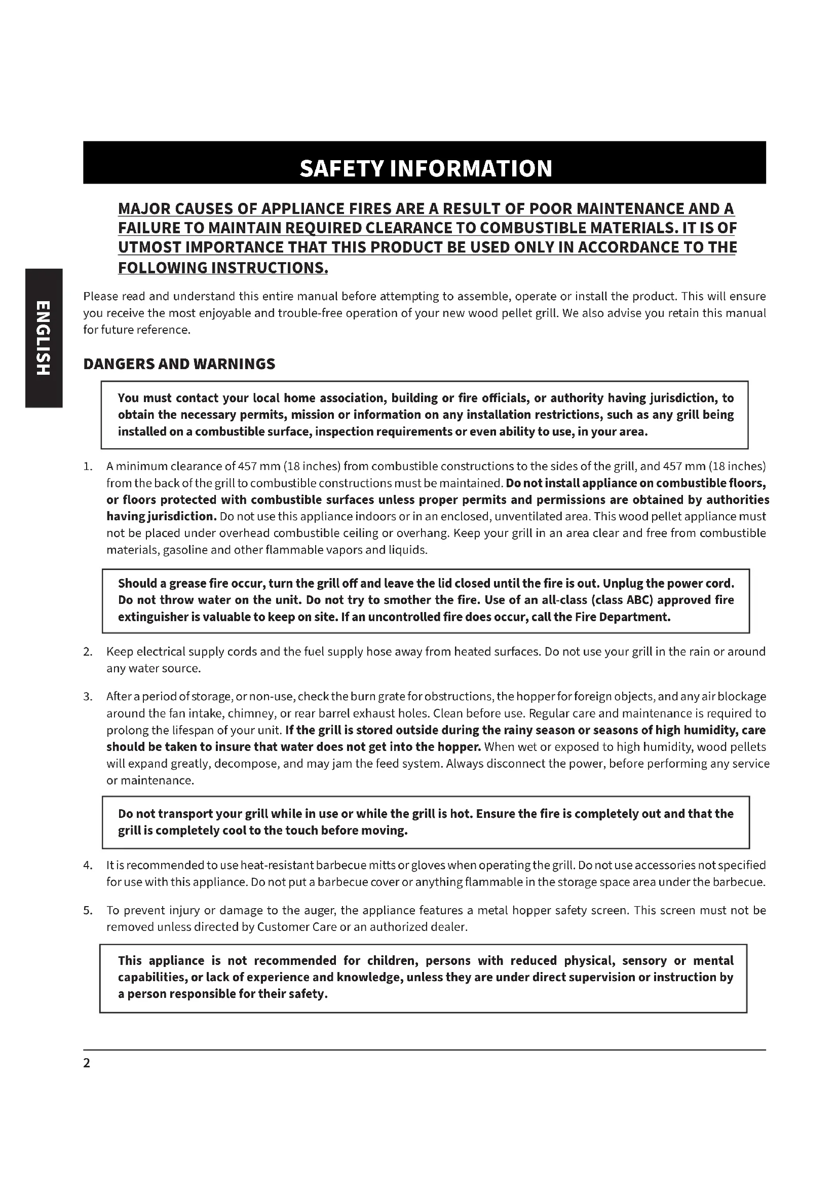 You must contact your local home association, building or fire oicials, or authority having jurisdiction, to obtain the necessary permits, mission or information on any installation restrictions, such as any grill being installed on a combustible surface, inspection requirements or even ability to use, in your area. 1. A minimum clearance of 457 mm (18 inches) from combustible constructions to the sides of the grill, and 457 mm (18 inches) from the back of the grill to combustible constructions must be maintained. Do not install appliance on combustible floors, or floors protected with combustible surfaces unless proper permits and permissions are obtained by authorities having jurisdiction. Do not use this appliance indoors or in an enclosed, unventilated area. This wood pellet appliance must not be placed under overhead combustible ceiling or overhang. Keep your grill in an area clear and free from combustible materials, gasoline and other flammable vapors and liquids. Should a grease fire occur, turn the grill o and leave the lid closed until the fire is out. Unplug the power cord. Do not throw water on the unit. Do not try to smother the fire. Use of an all-class (class ABC) approved fire extinguisher is valuable to keep on site. If an uncontrolled fire does occur, call the Fire Department. 2. Keep electrical supply cords and the fuel supply hose away from heated surfaces. Do not use your grill in the rain or around any water source. 3. Aer a period of storage, or non-use, check the burn grate for obstructions, the hopper for foreign objects, and any air blockage around the fan intake, chimney, or rear barrel exhaust holes. Clean before use. Regular care and maintenance is required to prolong the lifespan of your unit. If the grill is stored outside during the rainy season or seasons of high humidity, care should be taken to insure that water does not get into the hopper. When wet or exposed to high humidity, wood pellets will expand greatly, decompose, and may jam the feed system. Always disconnect the power, before performing any service or maintenance. Do not transport your grill while in use or while the grill is hot. Ensure the fire is completely out and that the grill is completely cool to the touch before moving. 4. It is recommended to use heat-resistant barbecue mitts or gloves when operating the grill. Do not use accessories not specified for use with this appliance. Do not put a barbecue cover or anything flammable in the storage space area under the barbecue. 5. To prevent injury or damage to the auger, the appliance features a metal hopper safety screen. This screen must not be removed unless directed by Customer Care or an authorized dealer. This appliance is not recommended for children, persons with reduced physical, sensory or mental capabilities, or lack of experience and knowledge, unless they are under direct supervision or instruction by a person responsible for their safety.3 ENGLISH
