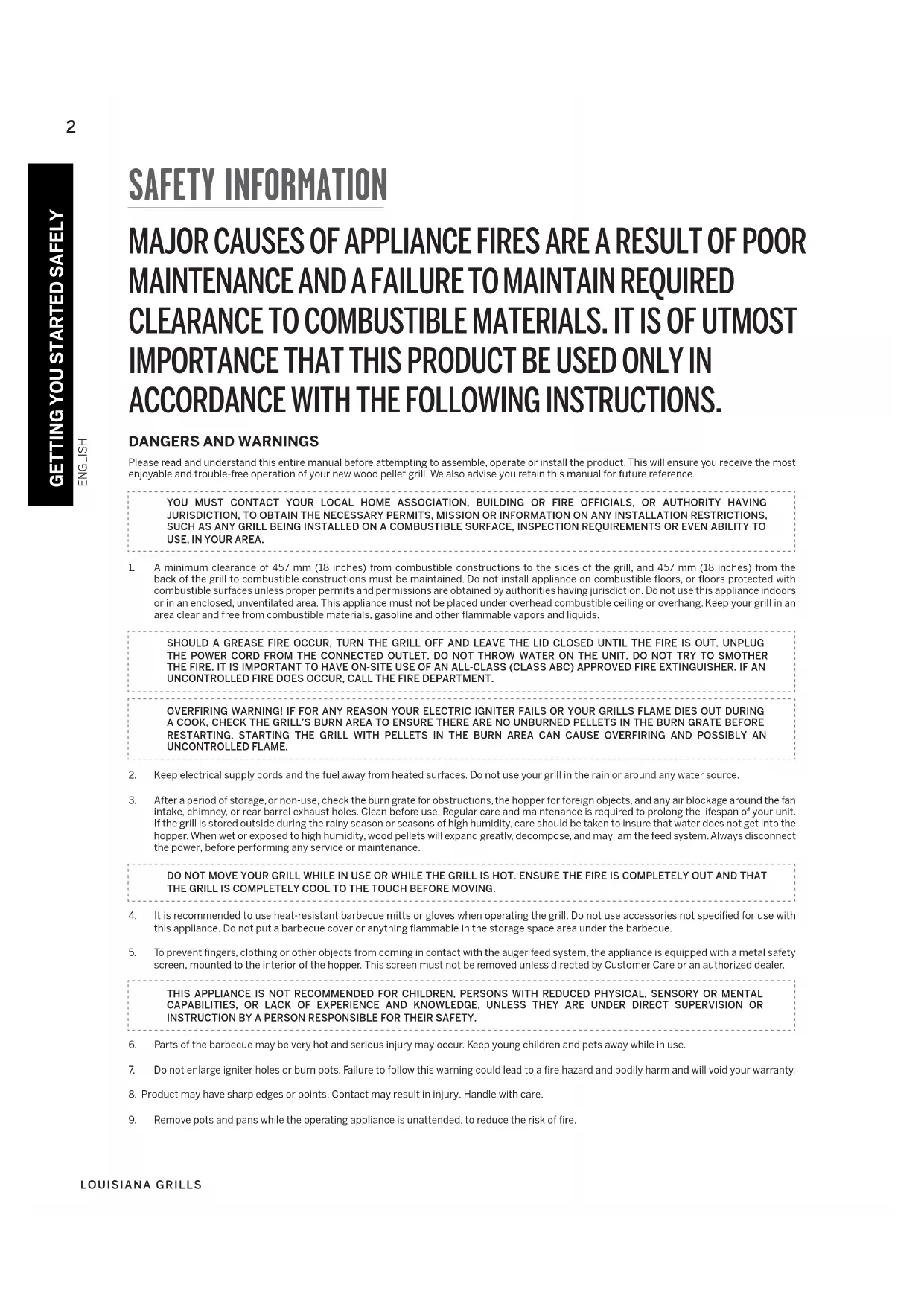 Copyright 2021. All right reserved. No part of this manual may be copied, transmitted, transcribed, stored in a retrieval system, in any form or by any means without expressed written permission of, DANSONS 3411 North 5th Avenue, Suite 500, Phoenix, AZ, USA 85013 sales@louisiana-grills.com service@louisiana-grills.com www.louisiana-grills.com CUSTOMER CARE USA: (480) 923-9632 Canada (Toll Free): 1-877-942-22465 ENGLISH www.louisiana-grills.com GETTING YOU STARTED SAFELY Make sure you know and understand the basics of safe use. SAFETY INFORMATION 2