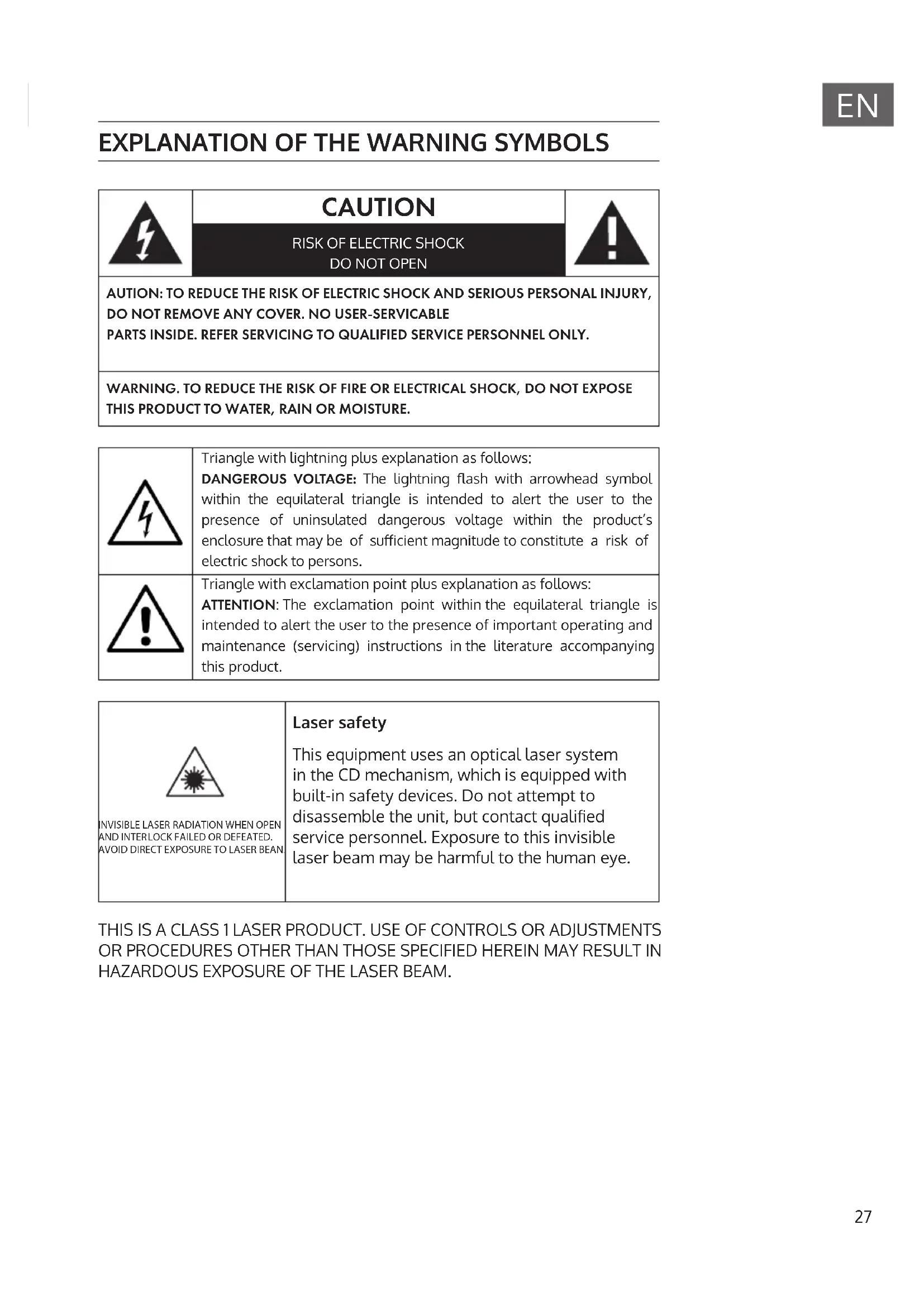 AUTION: TO REDUCE THE RISK OF ELECTRIC SHOCK AND SERIOUS PERSONAL INJURY, DO NOT REMOVE ANY COVER. NO USER-SERVICABLE PARTS INSIDE. REFER SERVICING TO QUALIFIED SERVICE PERSONNEL ONLY. WARNING. TO REDUCE THE RISK OF FIRE OR ELECTRICAL SHOCK, DO NOT EXPOSE THIS PRODUCT TO WATER, RAIN OR MOISTURE. Triangle with lightning plus explanation as follows: DANGEROUS VOLTAGE: The lightning ash with arrowhead symbol within the equilateral triangle is intended to alert the user to the presence of uninsulated dangerous voltage within the product‘s enclosure that may be of suicient magnitude to constitute a risk of electric shock to persons. Triangle with exclamation point plus explanation as follows: ATTENTION: The exclamation point within the equilateral triangle is intended to alert the user to the presence of important operating and maintenance (servicing) instructions in the literature accompanying this product. INVISIBLE LASER