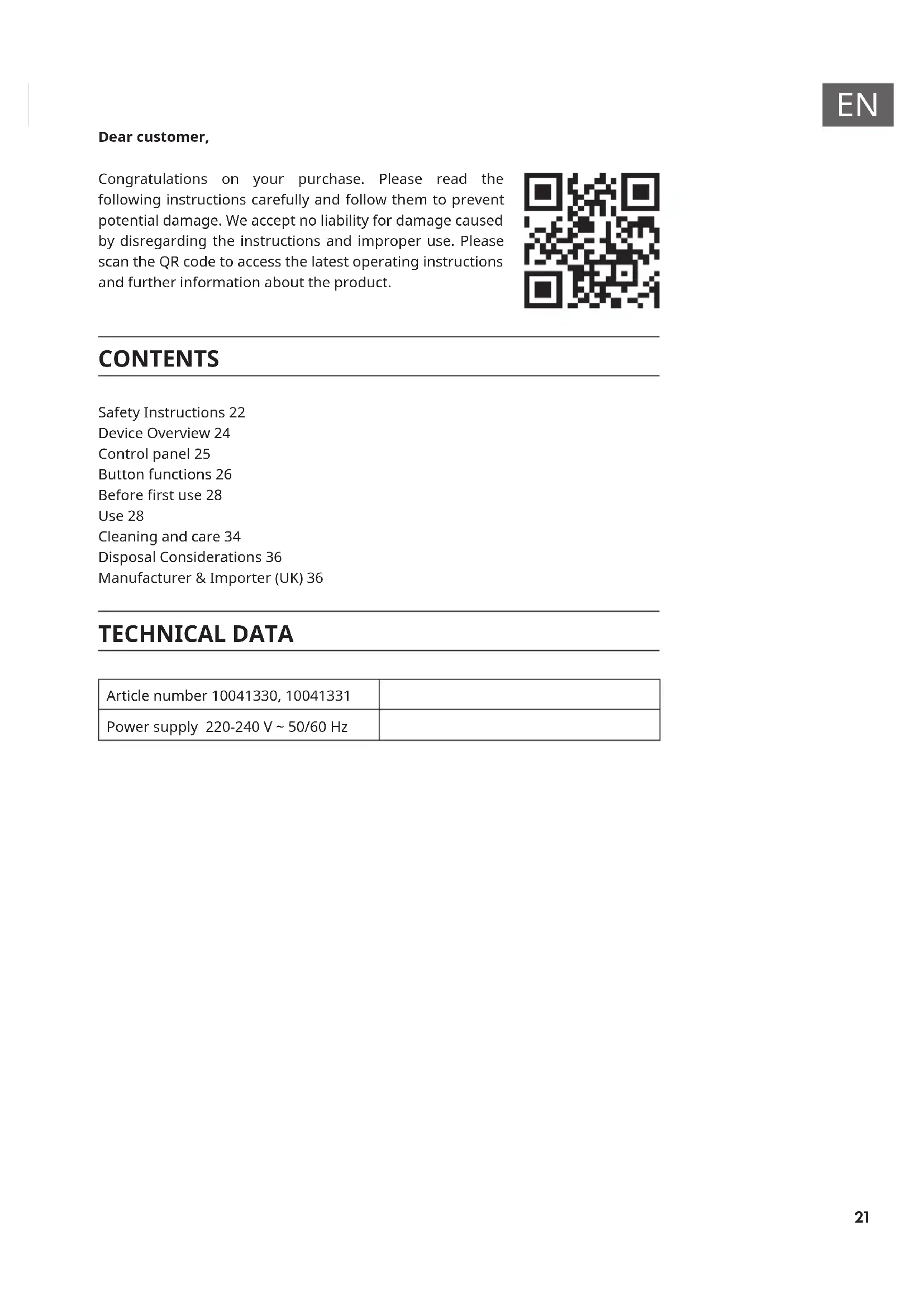 Dear customer, Congratulations on your purchase. Please read the following instructions carefully and follow them to prevent potential damage. We accept no liability for damage caused by disregarding the instructions and improper use. Please scan the QR code to access the latest operating instructions and further information about the product. CONTENTS Safety Instructions 22 Device Overview 24 Control panel 25 Button functions 26 Before rst use 28 Use 28 Cleaning and care 34 Disposal Considerations 36 Manufacturer & Importer (UK) 36 TECHNICAL DATA Article number 10041330, 10041331 Power supply 220-240 V ~ 50/60 Hz22