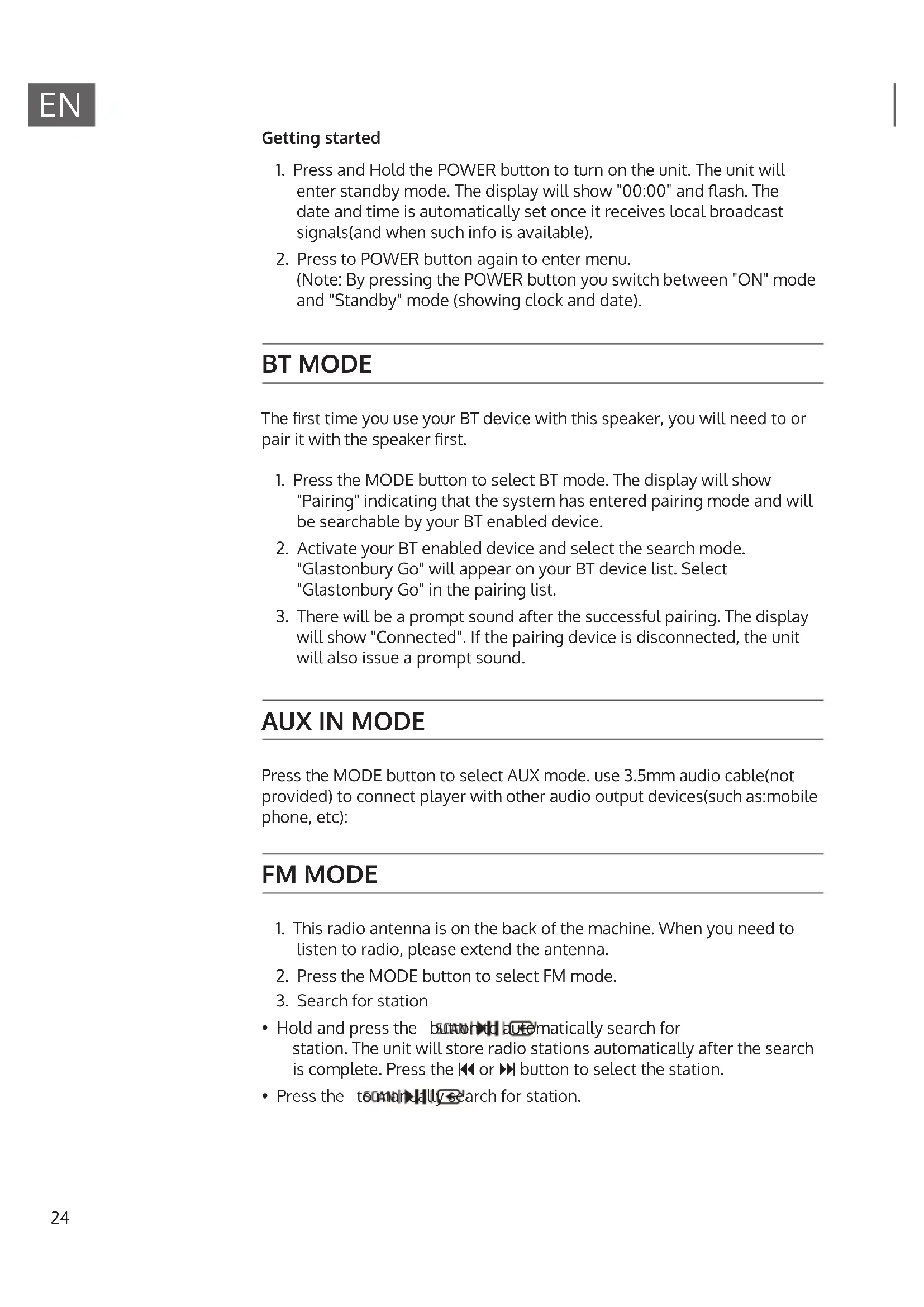 (Note: By pressing the POWER button you switch between "ON" mode and "Standby" mode (showing clock and date). BT MODE The rst time you use your BT device with this speaker, you will need to or pair it with the speaker rst.