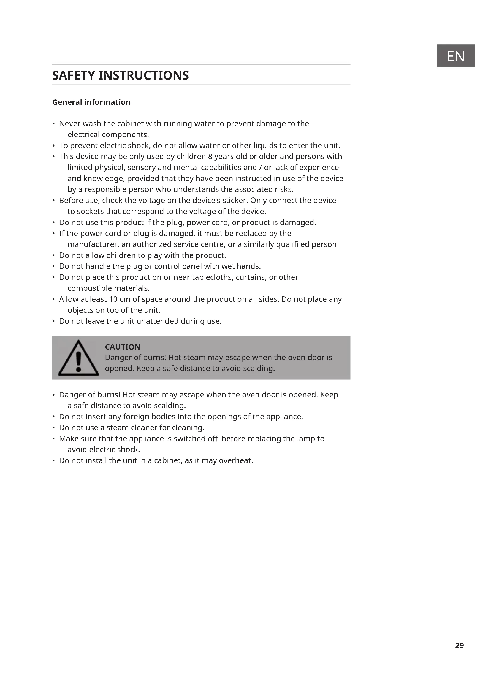 - Do not leave the unit unattended during use. CAUTION Danger of burns! Hot steam may escape when the oven door is opened. Keep a safe distance to avoid scalding.