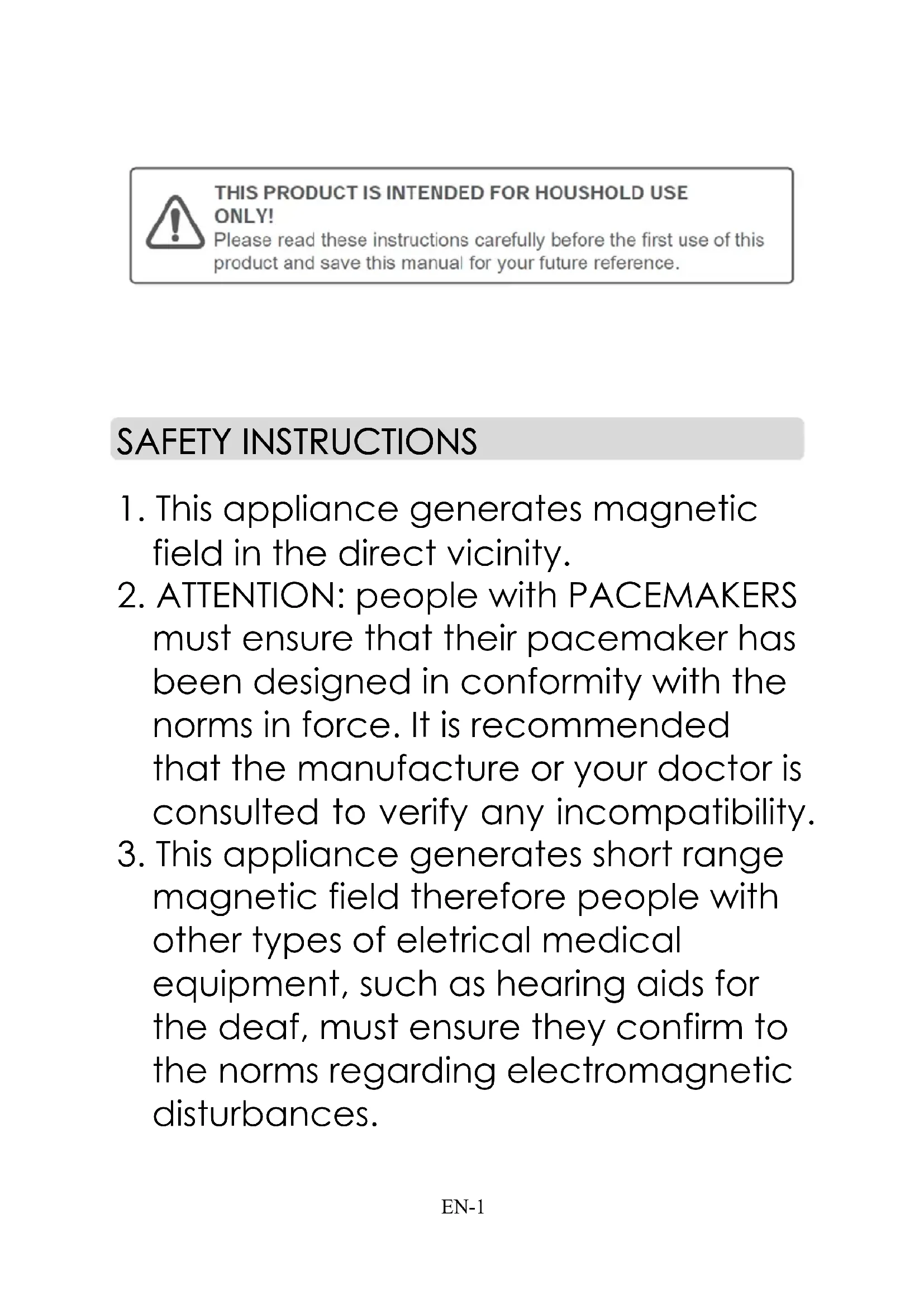 magnetic field therefore people with other types of eletrical medical equipment, such as hearing aids for the deaf, must ensure they confirm to the norms regarding electromagnetic disturbances. EN-14. This appliance has been designed for family use only. In case of doubts or questions, please contact the manufacturer.