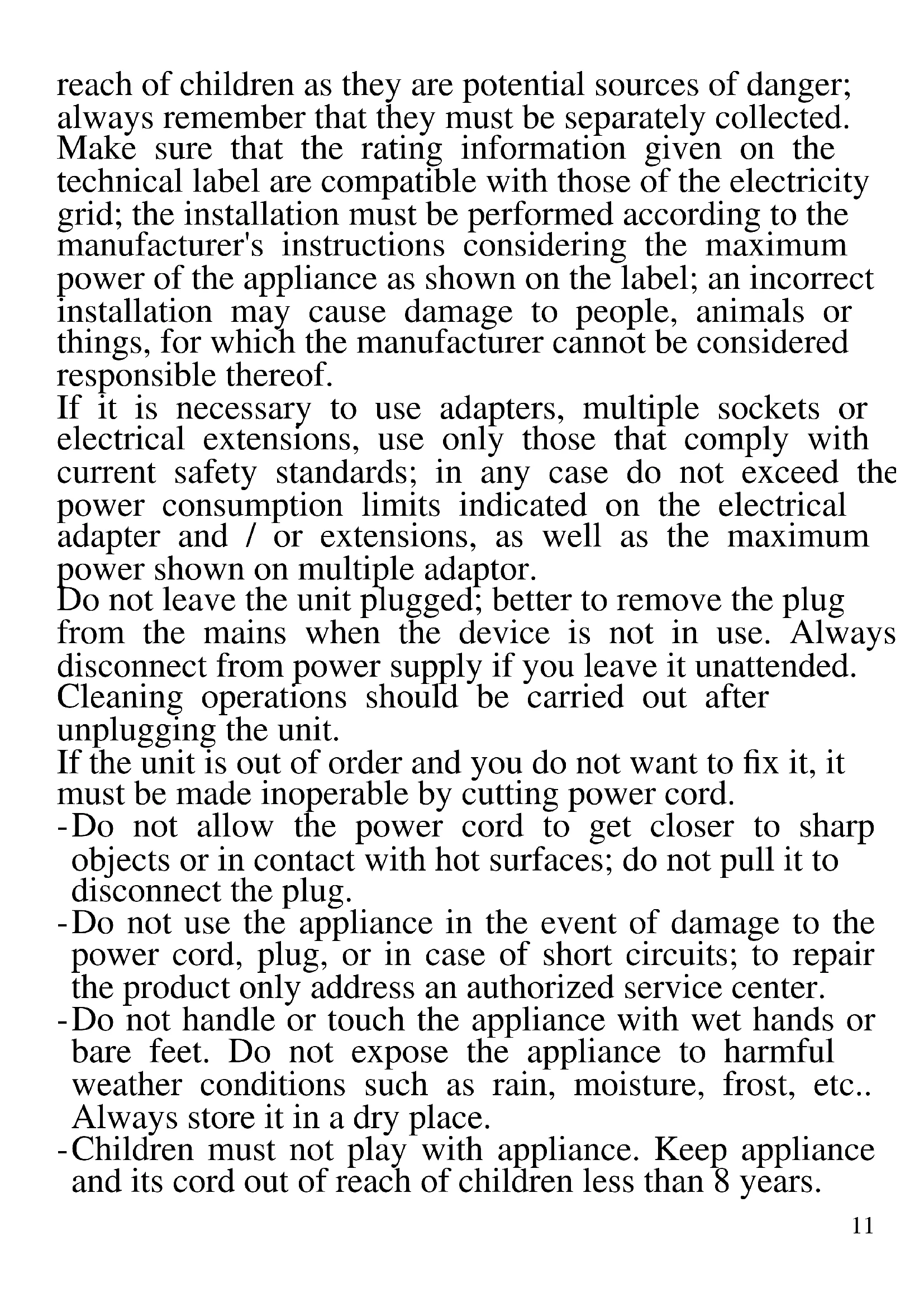 The following are important notes on the installation, use and maintenance; save this instruction manual for future reference; use the equipment only as specified in this guide; any other use is considered improper and dangerous; therefore, the manufacturer cannot be held responsible in the event of damages caused by improper, incorrect or unreasonable use. Before use, ensure the equipment is undamaged; if in doubt, do not attempt to use it and contact the authorized service center; do not leave packing materials (i.e. plastic bags, polystyrene foam, nails, staples, etc.) within the11 reach of children as they are potential sources of danger; always remember that they must be separately collected. Make sure that the rating information given on the technical label are compatible with those of the electricity grid; the installation must be performed according to the manufacturer's instructions considering the maximum power of the appliance as shown on the label; an incorrect installation may cause damage to people, animals or things, for which the manufacturer cannot be considered responsible thereof. If it is necessary to use adapters, multiple sockets or electrical extensions, use only those that comply with current safety standards; in any case do not exceed the power consumption limits indicated on the electrical adapter and / or extensions, as well as the maximum power shown on multiple adaptor. Do not leave the unit plugged; better to remove the plug from the mains when the device is not in use. Always disconnect from power supply if you leave it unattended. Cleaning operations should be carried out after unplugging the unit. If the unit is out of order and you do not want to fix it, it must be made inoperable by cutting power cord. - Do not allow the power cord to get closer to sharp objects or in contact with hot surfaces; do not pull it to disconnect the plug. - Do not use the appliance in the event of damage to the power cord, plug, or in case of short circuits; to repair the product only address an authorized service center. - Do not handle or touch the appliance with wet hands or bare feet. Do not expose the appliance to harmful weather conditions such as rain, moisture, frost, etc.. Always store it in a dry place. - Children must not play with appliance. Keep appliance and its cord out of reach of children less than 8 years.12 - This appliance can be used by children of 8 years and above and persons with reduced physical, sensory or mental capabilities or lack of experience and knowledge if they received supervision or instruction concerning use of the appliance in a safe way and understand hazards involved; children shall not play with the appliance; cleaning and user maintenance shall not be made by children without supervision. If the power cord is damaged, or in case of failure and / or malfunction do not tamper with the unit. The reparation must be done by manufacturer or by service center authorized by the manufacturer in order to prevent any risk. Failure to comply with the above may compromise the unit safety and invalidate the warranty.