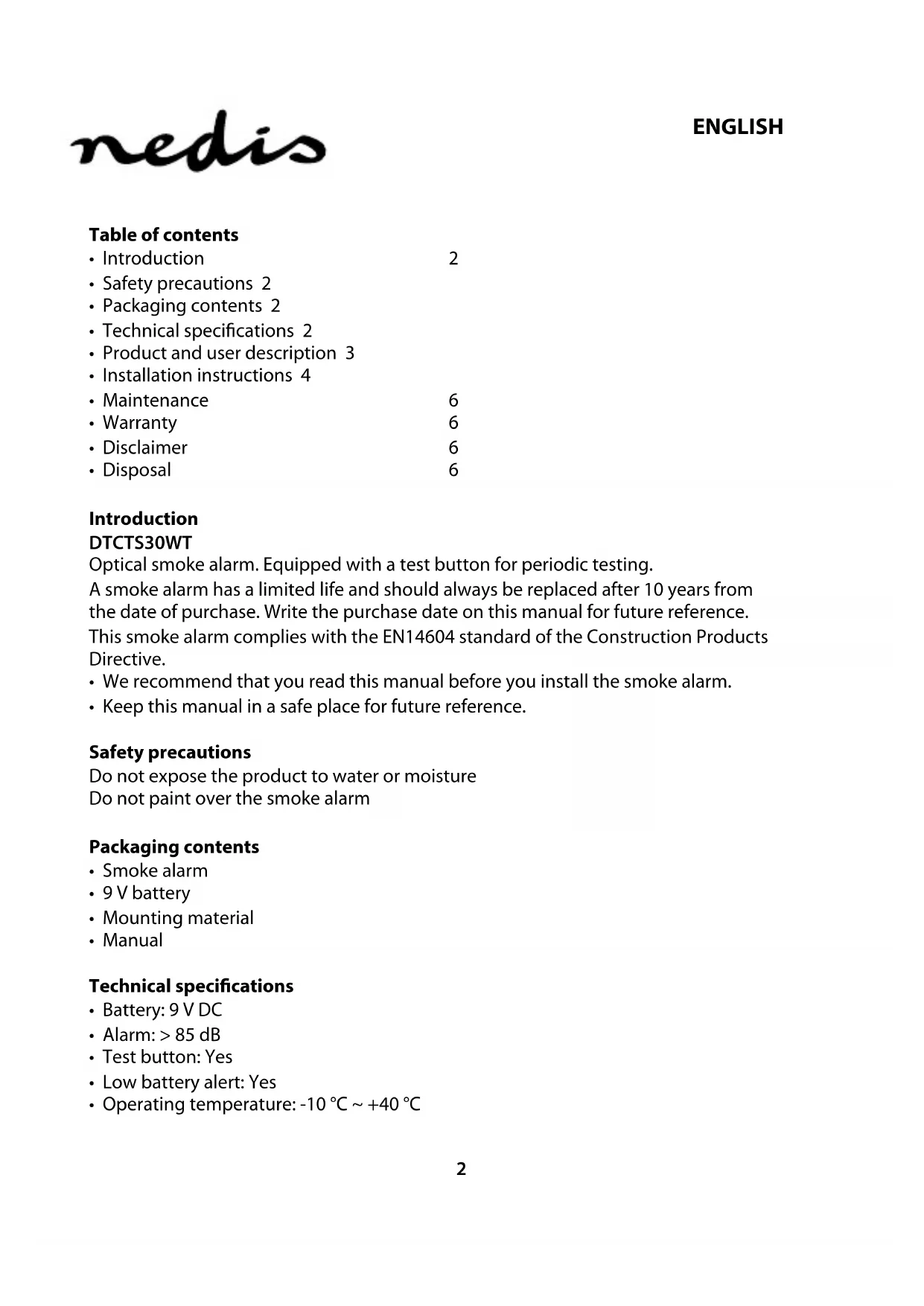DTCT30WT - Smoke detector NEDIS - Free user manual and instructions