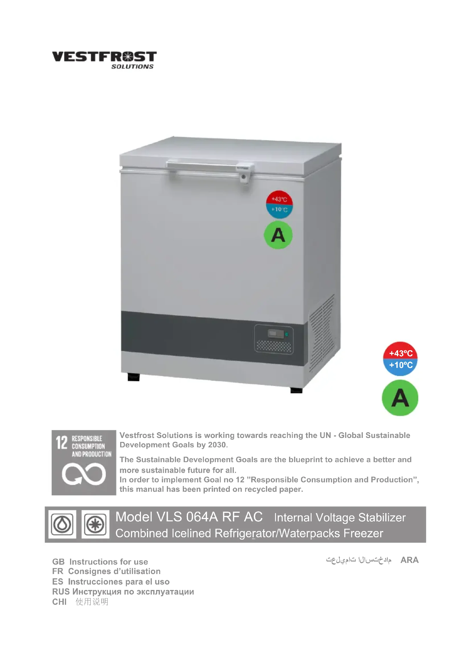 Model VLS 064 RF Combined Icelined Refrigerator/Waterpacks Freezer GB Instructions for use FR Consignes d’utilisation ES Instrucciones para el uso RUSИнструкцияпоэксплуатации CHI 使用说明 تعليماتالاستخدامARA Model VLS 064A RF AC Internal Voltage Stabilizer Combined Icelined Refrigerator/Waterpacks Freezer Vestfrost Solutions is working towards reaching the UN - Global Sustainable Development Goals by 2030.The Sustainable Development Goals are the blueprint to achieve a better and more sustainable future for all. In order to implement Goal no 12 ”Responsible Consumption and Production”, this manual has been printed on recycled paper. +43ºC +10ºCAs the appliance contains a ammable refrigerant, R600a as stated on nameplate, it is essen- tial to ensure that the refrigerant pipes are not damaged. The quantity and type of the refrigerant used in your appli- ance is indicated on the rating plate. Standard EN378 species that the room in which you install your appliance must have a volume of 1m³ per 8 g of hydro- carbon refrigerant used in the appliances. This is to avoid the formation of ammable gas/air mixtures in the room where the appliance is located in the event of a leak in the refrigerant circuit.