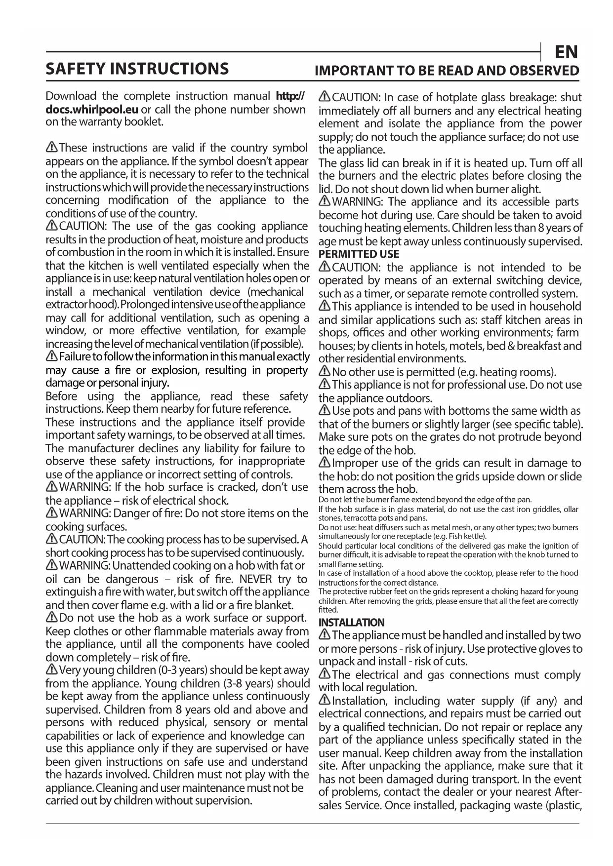Download the complete instruction manual http:// docs.whirlpool.eu or call the phone number shown on the warranty booklet. These instructions are valid if the country symbol appears on the appliance. If the symbol doesn’t appear on the appliance, it is necessary to refer to the technical instructions which will provide the necessary instructions concerning modication of the appliance to the conditions of use of the country. CAUTION: The use of the gas cooking appliance results in the production of heat, moisture and products of combustion in the room in which it is installed. Ensure that the kitchen is well ventilated especially when the appliance is in use: keep natural ventilation holes open or install a mechanical ventilation device (mechanical extractor hood). Prolonged intensive use of the appliance may call for additional ventilation, such as opening a window, or more eective ventilation, for example increasing the level of mechanical ventilation (if possible). Failure to follow the information in this manual exactly may cause a re or explosion, resulting in property damage or personal injury. Before using the appliance, read these safety instructions. Keep them nearby for future reference. These instructions and the appliance itself provide important safety warnings, to be observed at all times. The manufacturer declines any liability for failure to observe these safety instructions, for inappropriate use of the appliance or incorrect setting of controls.