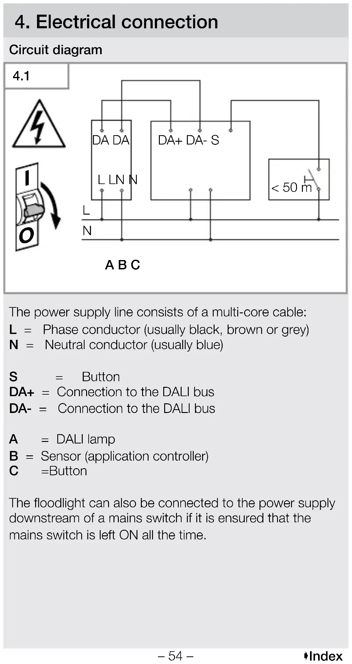 The power supply line consists of a multi-core cable: L = Phase conductor (usually black, brown or grey) N = Neutral conductor (usually blue) S = Button DA+ = Connection to the DALI bus DA- = Connection to the DALI bus A = DALI lamp B = Sensor (application controller) C = Button The oodlight can also be connected to the power supply downstream of a mains switch if it is ensured that the mains switch is left ON all the time.– 55 – Index The following applies to the wiring of the sensor: According to VDE 0100 520 Section 6, a multi-core cable containing both the mains voltage lines and the control lines (e.g. NYM 5 × 1.5) can be used for wiring between the DALI electronic ballast (control gear) and the DALI application controller. The maximum cable length between the DALI application controller and the DALI electronic ballast (control gear) should not exceed 300 m (at 1.5 mm²). After installation and switching on, the LED of the sensor lights up for 10seconds.– 56 – Index