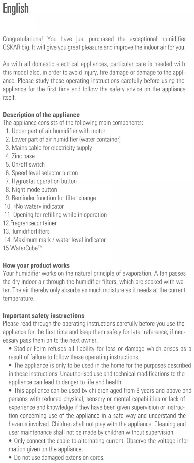 Download the instructions for your Humidifier in PDF format for free! Find your manual Oskar Big - WILFA and take your electronic device back in hand. On this page are published all the documents necessary for the use of your device. Oskar Big by WILFA.