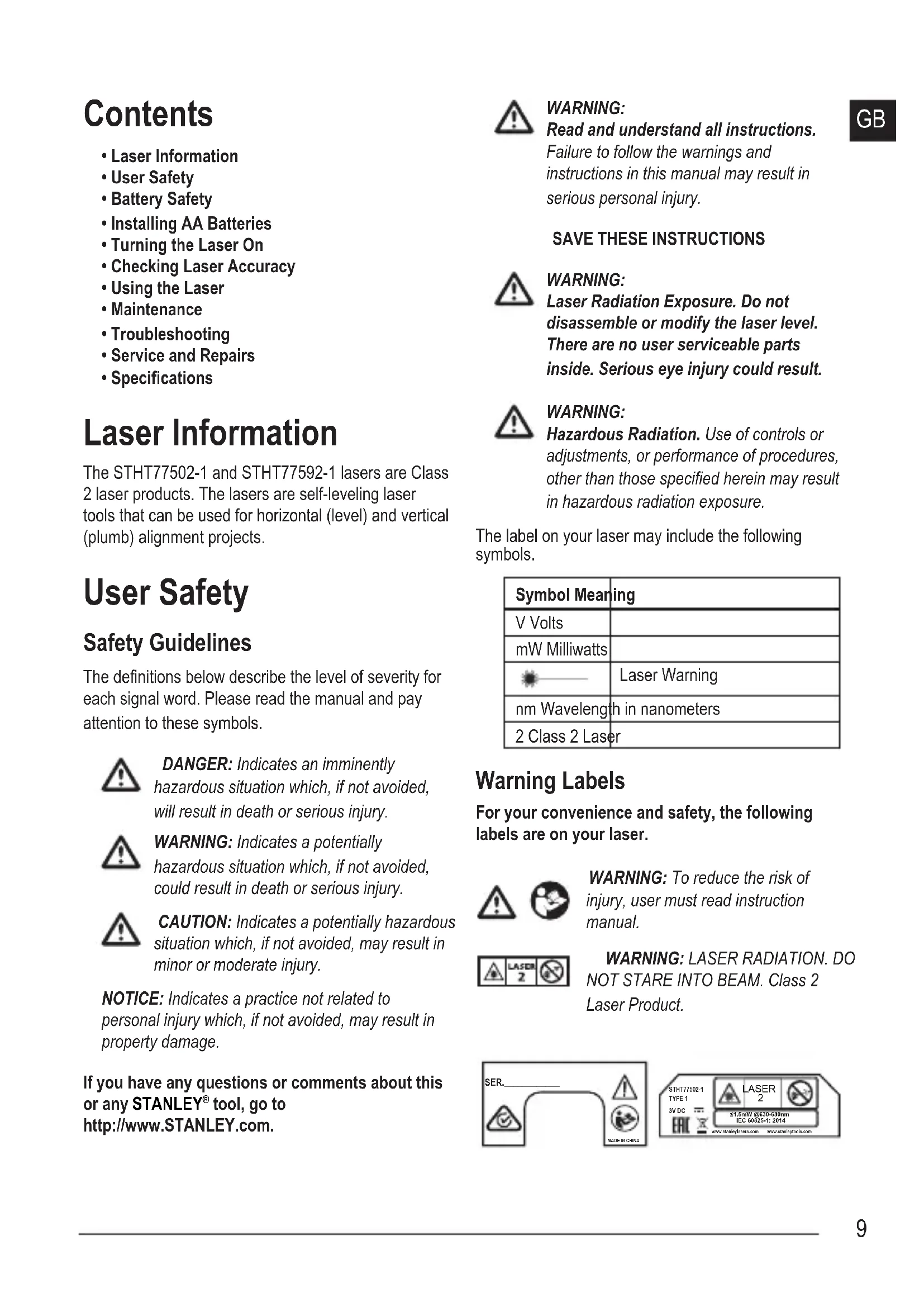 - Specications Laser Information The STHT77502-1 and STHT77592-1 lasers are Class 2 laser products. The lasers are self-leveling laser tools that can be used for horizontal (level) and vertical (plumb) alignment projects. User Safety Safety Guidelines The denitions below describe the level of severity for each signal word. Please read the manual and pay attention to these symbols.