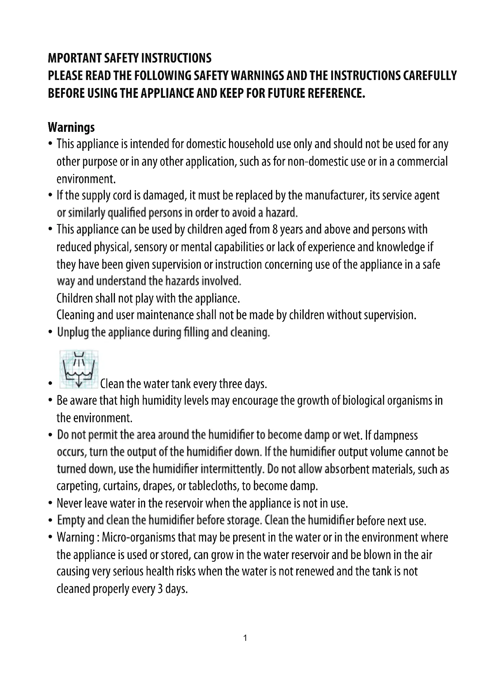 - Warning : Micro-organisms that may be present in the water or in the environment where the appliance is used or stored, can grow in the water reservoir and be blown in the air causing very serious health risks when the water is not renewed and the tank is not cleaned properly every 3 days.