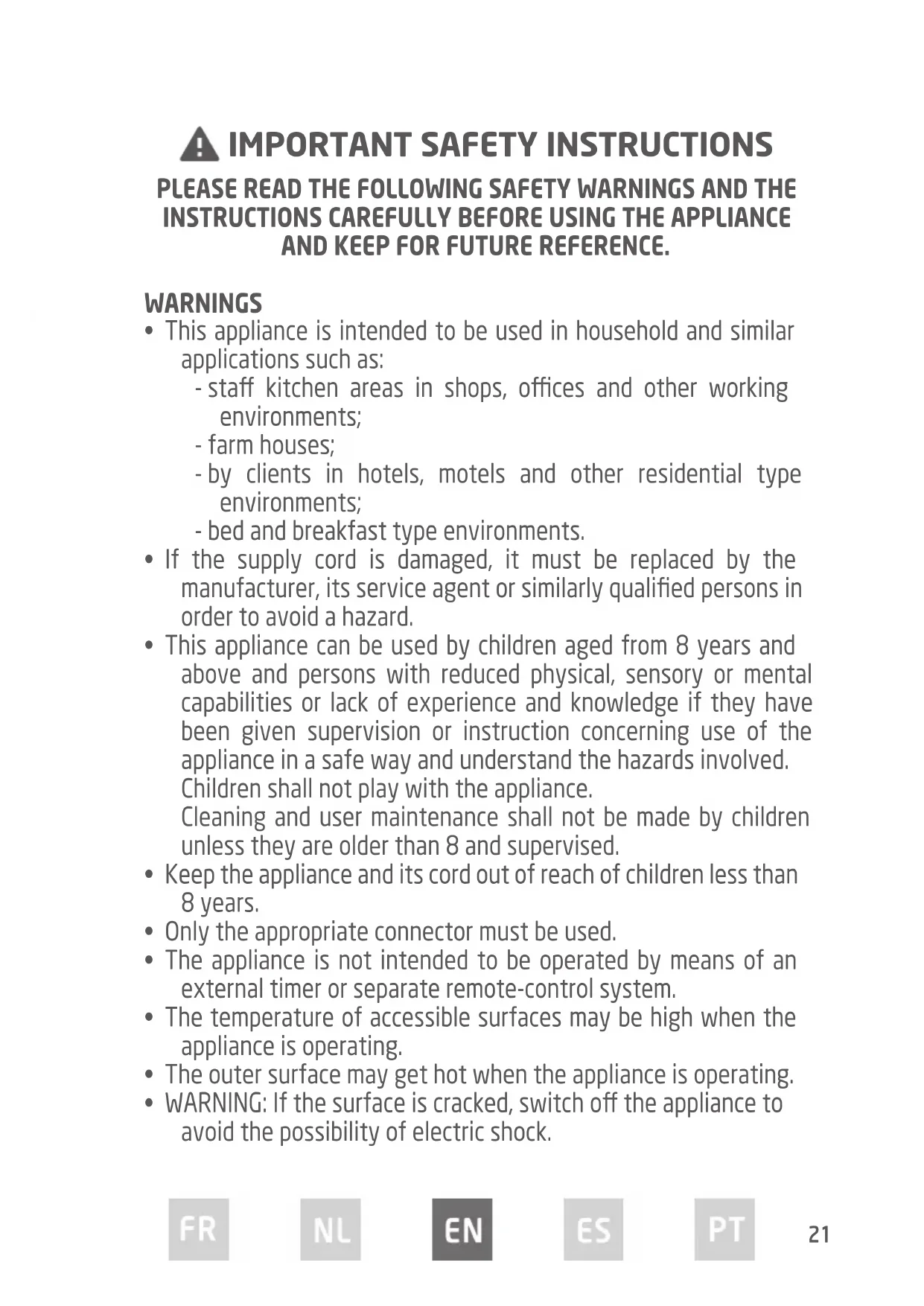 - Keep the appliance and its cord out of reach of children less than 8 years.