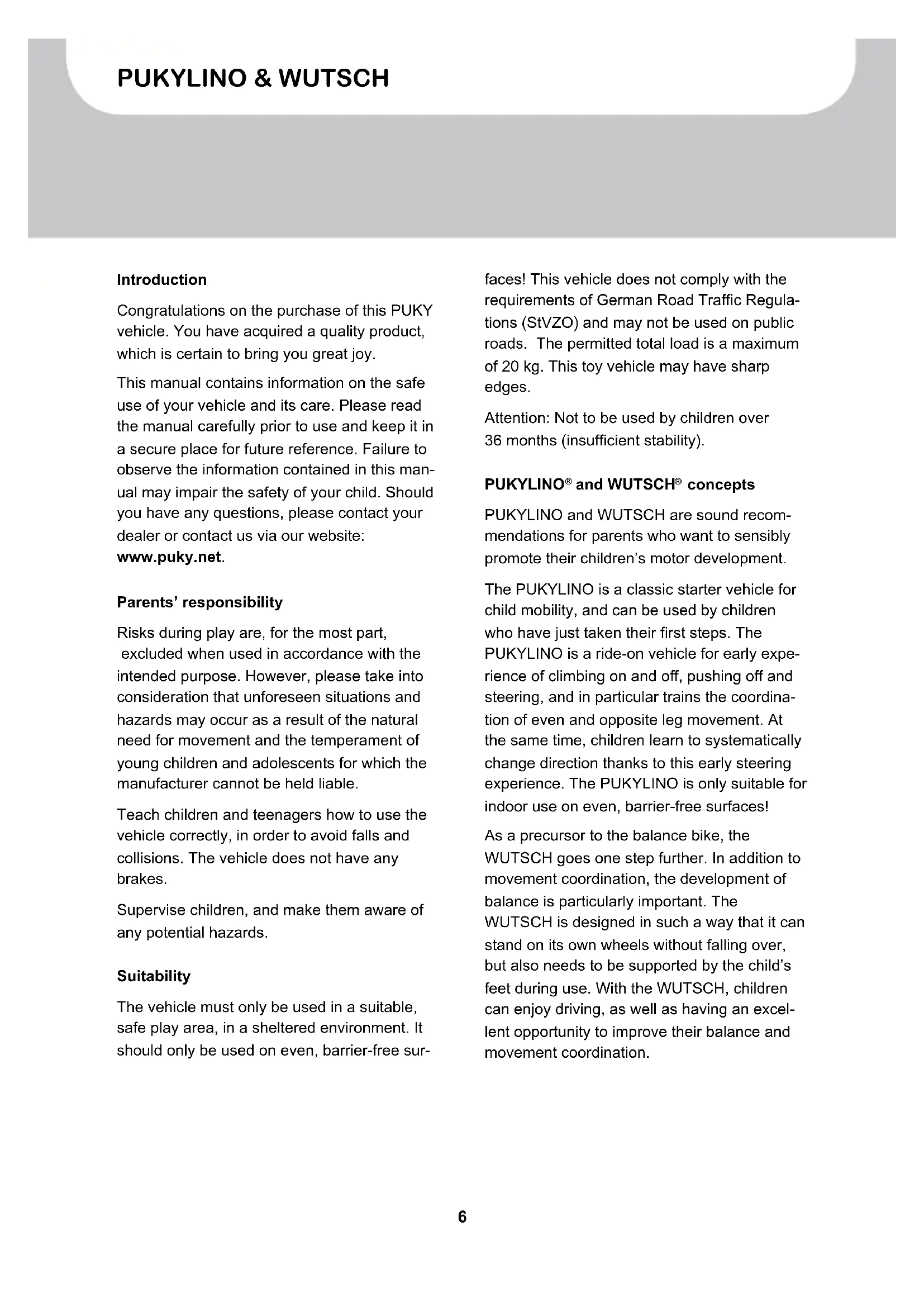 concepts PUKYLINO and WUTSCH are sound recom- mendations for parents who want to sensibly promote their children’s motor development. The PUKYLINO is a classic starter vehicle for child mobility, and can be used by children who have just taken their first steps. The PUKYLINO is a ride-on vehicle for early expe- rience of climbing on and off, pushing off and steering, and in particular trains the coordina- tion of even and opposite leg movement. At the same time, children learn to systematically change direction thanks to this early steering experience. The PUKYLINO is only suitable for indoor use on even, barrier-free surfaces! As a precursor to the balance bike, the WUTSCH goes one step further. In addition to movement coordination, the development of balance is particularly important. The WUTSCH is designed in such a way that it can stand on its own wheels without falling over, but also needs to be supported by the child’s feet during use. With the WUTSCH, children can enjoy driving, as well as having an excel- lent opportunity to improve their balance and movement coordination.7 User Manual GBPUKYLINO & WUTSCH Usage It is necessary to wear closed shoes. The vehi- cle must not be driven in the vicinity of stairs, slopes, steep terrain, swimming pools, or other bodies of water. Stairs in the vicinity must be secured to prevent children from riding up or down them on the vehicle. The legal liability for material defects applies. Damages caused by inappropriate use, the effects of force, insufficient maintenance or due to normal wear and tear are excluded from the liability of material defects. CE mark This product complies with the European Toy Safety Directive 2009/48/EC and therefore bears the CE mark. Type label The type label is attached to the underside of the rear frame. Please record the information on the identification plate in the cycle passport at the end of this manual so that you have all the information you need in the event of any questions or when ordering spare parts. Maintenance and care Examine the vehicle at regular intervals for any wear, and to check that the screws are still properly tightened. Self-tightening nuts are hard to loosen and must be replaced after complete disassembly! In order to maintain the high, design-specified safety levels, all worn or defective parts are to be immediately replaced by original PUKY spare parts. For safety reasons, the vehicle should not be used until it has been fully re- paired. Bent or deformed parts should not be repaired but instead should be replaced. Spare parts: Wheels, axle stop (WUTSCH only) The vehicle must not be cleaned with a high-pressure cleaner. Clean the tricycle using a mild soapy solution and carefully wipe dry using a soft cloth. Keep the vehicle away from corrosion-promoting materials (road salt, sea water, fertiliser). The vehicle must not be stored in damp conditions. Unpacking and scope of delivery Do not use any sharp objects when opening the packaging and removing protective materi- al. By doing so, you may damage the paint or parts of the vehicle. ❚ Remove all parts from the packaging. ❚ Remove the protective material. Keep all packaging material out of reach of children – there is a risk of suffocation. ❚ Examine the package for completeness and proper condition. If anything is missing, please contact your dealer before you start to assemble the vehicle.PUKYLINO & WUTSCH