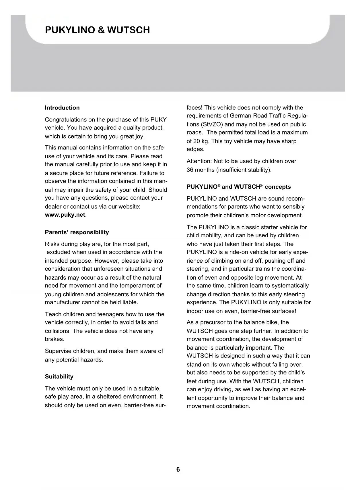 concepts PUKYLINO and WUTSCH are sound recom- mendations for parents who want to sensibly promote their children’s motor development. The PUKYLINO is a classic starter vehicle for child mobility, and can be used by children who have just taken their first steps. The PUKYLINO is a ride-on vehicle for early expe- rience of climbing on and off, pushing off and steering, and in particular trains the coordina- tion of even and opposite leg movement. At the same time, children learn to systematically change direction thanks to this early steering experience. The PUKYLINO is only suitable for indoor use on even, barrier-free surfaces! As a precursor to the balance bike, the WUTSCH goes one step further. In addition to movement coordination, the development of balance is particularly important. The WUTSCH is designed in such a way that it can stand on its own wheels without falling over, but also needs to be supported by the child’s feet during use. With the WUTSCH, children can enjoy driving, as well as having an excel- lent opportunity to improve their balance and movement coordination.7 User Manual GBPUKYLINO & WUTSCH Usage It is necessary to wear closed shoes. The vehi- cle must not be driven in the vicinity of stairs, slopes, steep terrain, swimming pools, or other bodies of water. Stairs in the vicinity must be secured to prevent children from riding up or down them on the vehicle. The legal liability for material defects applies. Damages caused by inappropriate use, the effects of force, insufficient maintenance or due to normal wear and tear are excluded from the liability of material defects. CE mark This product complies with the European Toy Safety Directive 2009/48/EC and therefore bears the CE mark. Type label The type label is attached to the underside of the rear frame. Please record the information on the identification plate in the cycle passport at the end of this manual so that you have all the information you need in the event of any questions or when ordering spare parts. Maintenance and care Examine the vehicle at regular intervals for any wear, and to check that the screws are still properly tightened. Self-tightening nuts are hard to loosen and must be replaced after complete disassembly! In order to maintain the high, design-specified safety levels, all worn or defective parts are to be immediately replaced by original PUKY spare parts. For safety reasons, the vehicle should not be used until it has been fully re- paired. Bent or deformed parts should not be repaired but instead should be replaced. Spare parts: Wheels, axle stop (WUTSCH only) The vehicle must not be cleaned with a high-pressure cleaner. Clean the tricycle using a mild soapy solution and carefully wipe dry using a soft cloth. Keep the vehicle away from corrosion-promoting materials (road salt, sea water, fertiliser). The vehicle must not be stored in damp conditions. Unpacking and scope of delivery Do not use any sharp objects when opening the packaging and removing protective materi- al. By doing so, you may damage the paint or parts of the vehicle. ❚ Remove all parts from the packaging. ❚ Remove the protective material. Keep all packaging material out of reach of children – there is a risk of suffocation. ❚ Examine the package for completeness and proper condition. If anything is missing, please contact your dealer before you start to assemble the vehicle.PUKYLINO & WUTSCH