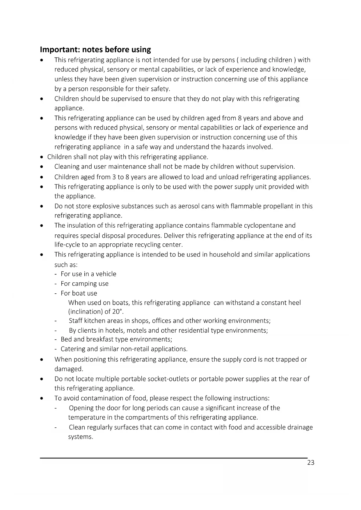 - This refrigerating appliance is intended to be used in household and similar applications such as: - For use in a vehicle - For camping use - For boat use When used on boats, this refrigerating appliance can withstand a constant heel (inclination) of 20°. - Staff kitchen areas in shops, offices and other working environments; - By clients in hotels, motels and other residential type environments; - Bed and breakfast type environments; - Catering and similar non-retail applications.
