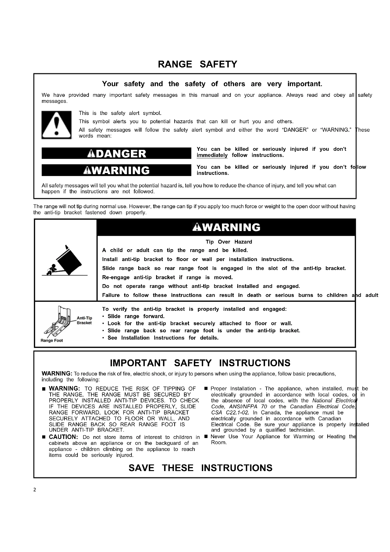 to loosen the four leveling legs. This may be done with the range on its back or with the range supported on two legs after the range has been placed back to a standing position. NOTE: To place range back up into a standing position, put a sheet of cardboard or hardboard in front of range. Using two or more people, stand range back up onto the cardboard or hardboard. WARNING Tip Over Hazard A child or adult can tip the range and be killed. Install anti-tip bracket to floor or wall per installation instructions. Slide range back so rear range foot is engaged in the slot of the anti-tip bracket. Re-engage anti-tip bracket if range is moved. Do not operate range without anti-tip bracket installed and engaged. Failure to follow these instructions can result in death or serious burns to children and adults.