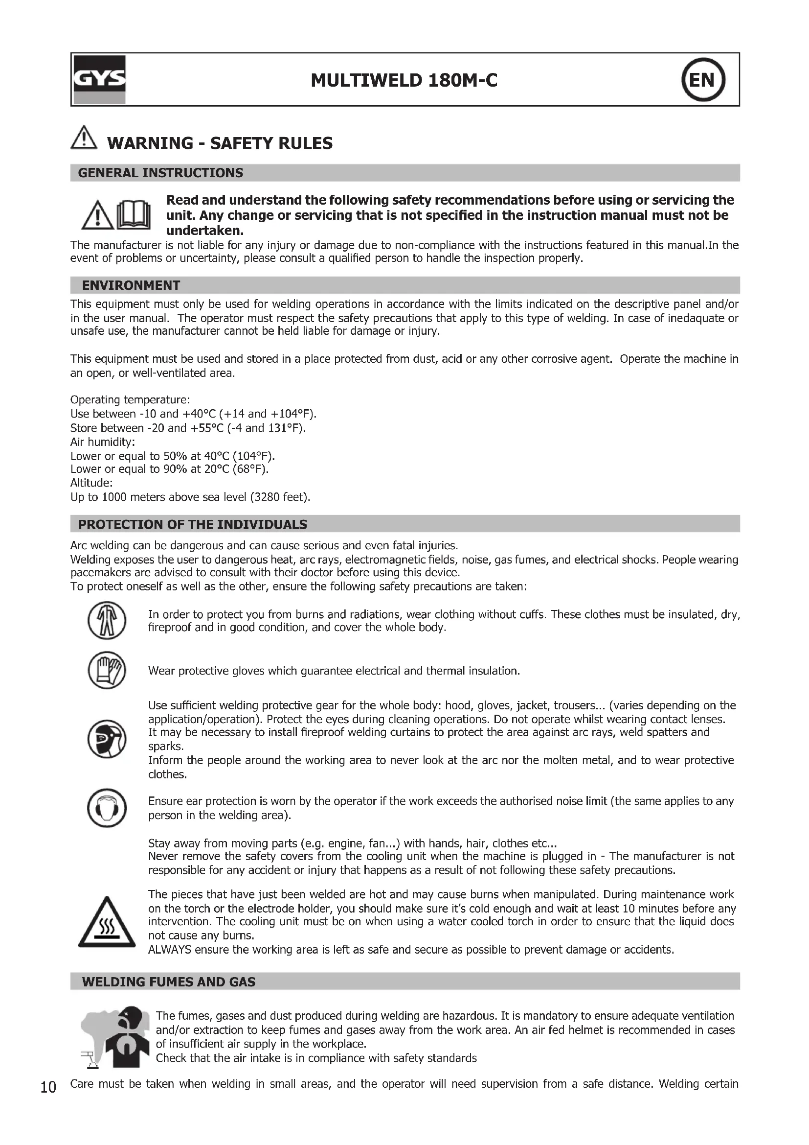 GENERAL INSTRUCTIONS Read and understand the following safety recommendations before using or servicing the unit. Any change or servicing that is not specied in the instruction manual must not be undertaken. The manufacturer is not liable for any injury or damage due to non-compliance with the instructions featured in this manual.In the event of problems or uncertainty, please consult a qualied person to handle the inspection properly. ENVIRONMENT This equipment must only be used for welding operations in accordance with the limits indicated on the descriptive panel and/or in the user manual. The operator must respect the safety precautions that apply to this type of welding. In case of inedaquate or unsafe use, the manufacturer cannot be held liable for damage or injury. This equipment must be used and stored in a place protected from dust, acid or any other corrosive agent. Operate the machine in an open, or well-ventilated area.Operating temperature:Use between -10 and +40°C (+14 and +104°F).Store between -20 and +55°C (-4 and 131°F).Air humidity:Lower or equal to 50% at 40°C (104°F).Lower or equal to 90% at 20°C (68°F).Altitude:Up to 1000 meters above sea level (3280 feet).