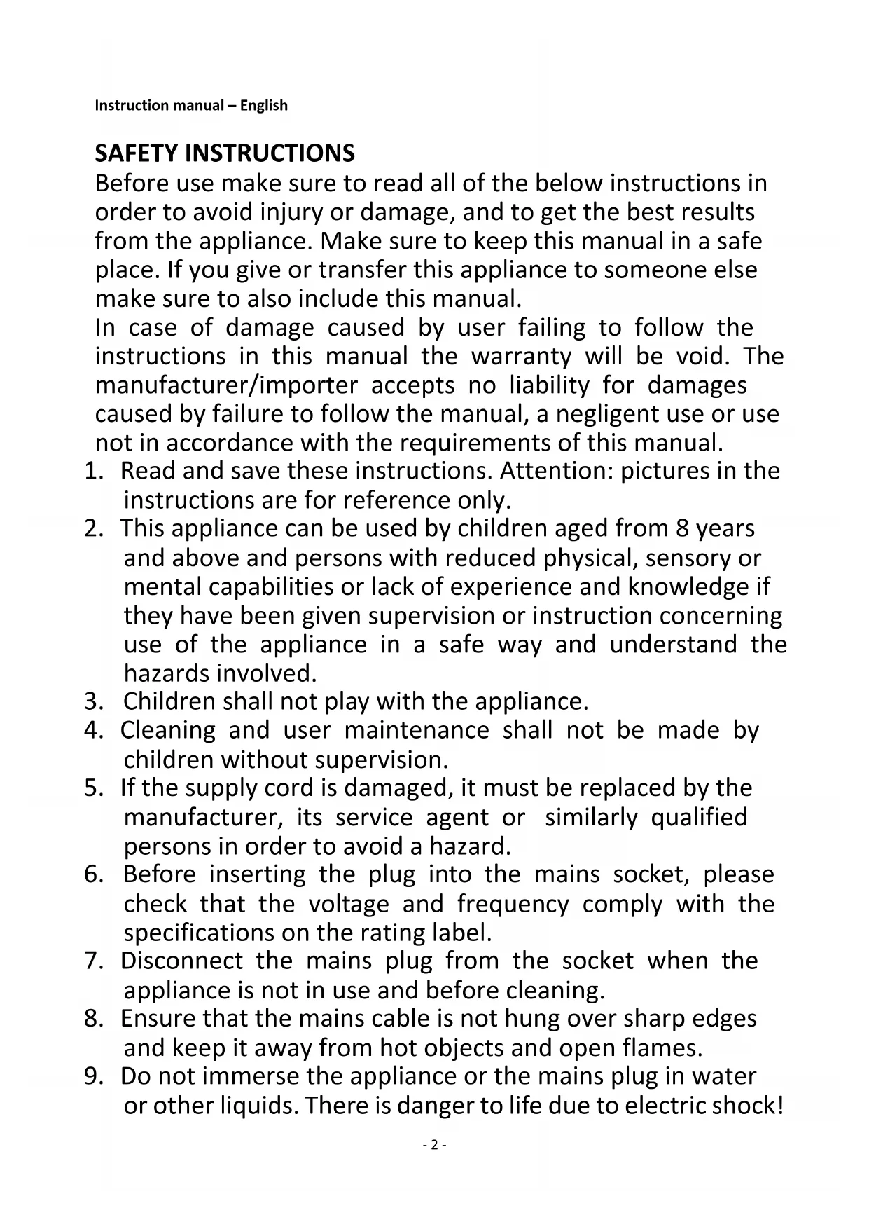 Before delivery our devices are subjected to rigorous quality control. If, despite all care, damage has occurred during production or transportation, please return the device to your dealer. For the purchased device we provide 2 years guarantee, commencing from the day of sale. If you have a defective product, you can directly go back to the point of purchase. Defects which arise due to improper handling of the device and malfunctions due to interventions and repairs by third parties or the fitting of non-original parts are not covered by this guarantee. Always keep your receipt, without the receipt you can’t claim any form of warranty. Damage caused by not following the instruction manual, will lead to a void of warranty, if this results in consequential damages then we will not be liable. Neither can we hold responsible for material damage or personal injury caused by improper use or if the instruction manual are not properly executed. Damage to accessories does not mean free replacement of the whole appliance. In such case please contact our service department. Broken glass or breakage of plastic parts is always subject to a charge. Defects to consumables or parts subjected to wearing, as well as cleaning, maintenance or the replacement of said parts are not covered by the warranty and are to be paid.- 12 -