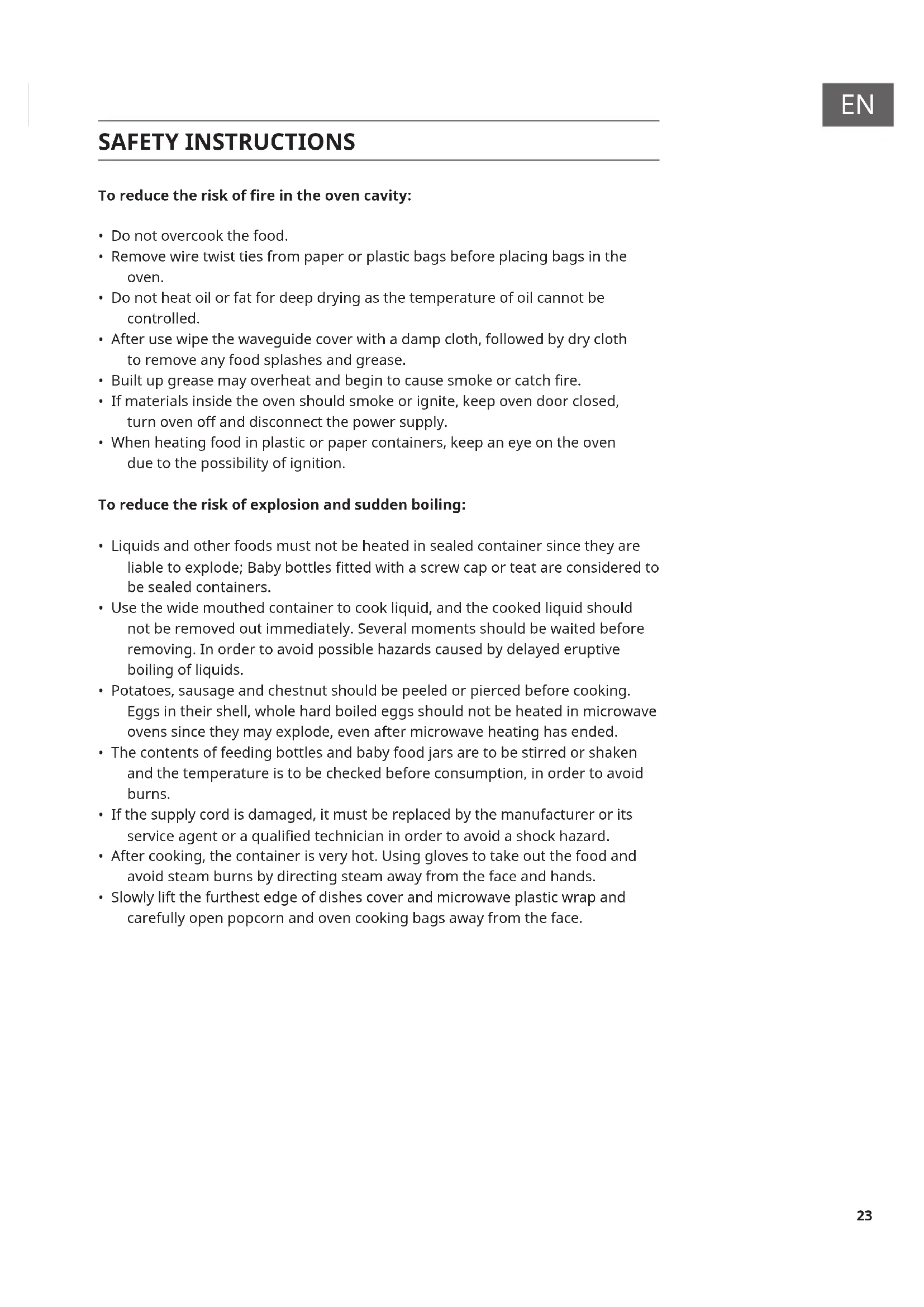 COOKING TIPS The following factors may affect the cooking result: Food arrangement Place thicker areas towards outside of dish, the thinner part towards the centre and spread it evenly. Do not overlap if possible. Cooking time length Start cooking with a short time setting, evaluate it after it times out and extend it according to the actual need. Over cooking may result in smoke and burns. Cooking food evenly Food such as chicken, hamburger or steak should be turned once during cooking. Depending on the type of food, if applicable, stir it from outside to centre of dish once or twice during cooking Allow standing time After cooking times out, leave the food in the oven for an adequate length of time, this allows it to complete its cooking cycle and cooling it down in a gradual manner. Whether the food is done Color and hardness of food help to determine if it is done, these include: Steam coming out from all parts of food, not just the edge, Joints of poultry can be moved easily, Pork or poultry shows no signs of blood and Fish is opaque and can be sliced easily with a fork. Microwave safe plastic wrap When cooking food with high fat content, do not allow the plastic wrap come into contact with food as it may melt Microwave safe plastic cookware Some microwave safe plastic cookware might not be suitable for cooking foods with high fat and sugar content. Also, the preheating time specied in the dish instruction manual must not be exceeded.28