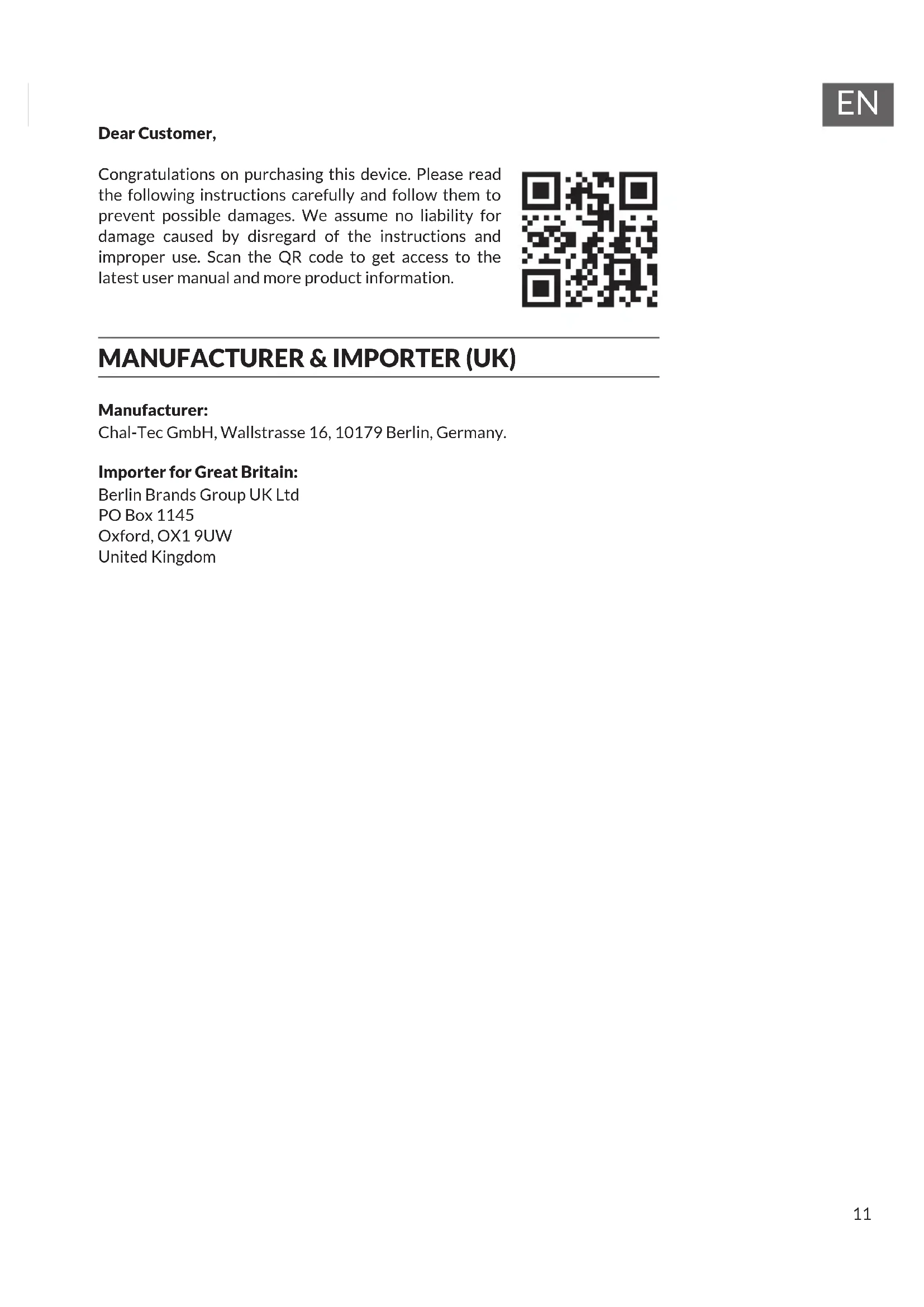 Dear Customer, Congratulations on purchasing this device. Please read the following instructions carefully and follow them to prevent possible damages. We assume no liability for damage caused by disregard of the instructions and improper use. Scan the QR code to get access to the latest user manual and more product information. MANUFACTURER & IMPORTER (UK) Manufacturer: Chal-Tec GmbH, Wallstrasse 16, 10179 Berlin, Germany. Importer for Great Britain: Berlin Brands Group UK Ltd PO Box 1145 Oxford, OX1 9UW United Kingdom12