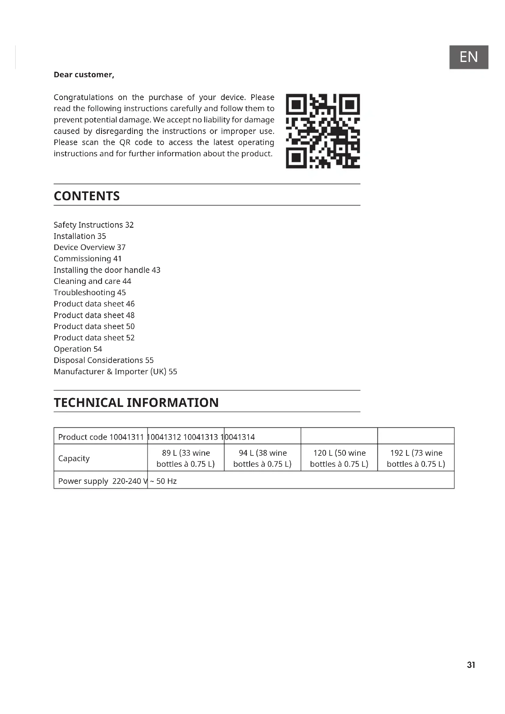 Dear customer, Congratulations on the purchase of your device. Please read the following instructions carefully and follow them to prevent potential damage. We accept no liability for damage caused by disregarding the instructions or improper use. Please scan the QR code to access the latest operating instructions and for further information about the product. CONTENTS Safety Instructions 32 Installation 35 Device Overview 37 Commissioning 41 Installing the door handle 43 Cleaning and care 44 Troubleshooting 45 Product data sheet 46 Product data sheet 48 Product data sheet 50 Product data sheet 52 Operation 54 Disposal Considerations 55 Manufacturer & Importer (UK) 55 TECHNICAL INFORMATION Product code 10041311 10041312 10041313 10041314 Capacity 89 L (33 wine bottles à 0.75 L) 94 L (38 wine bottles à 0.75 L) 120 L (50 wine bottles à 0.75 L) 192 L (73 wine bottles à 0.75 L) Power supply 220-240 V ~ 50 Hz32