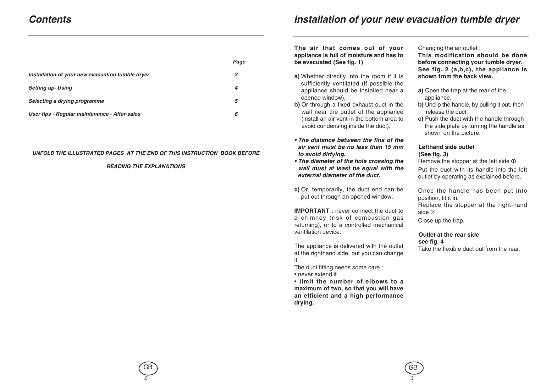 Codes : 15900 A - 07/03 Contents Installation of your new evacuation tumble dryer Page Installation of your new evacuation tumble dryer