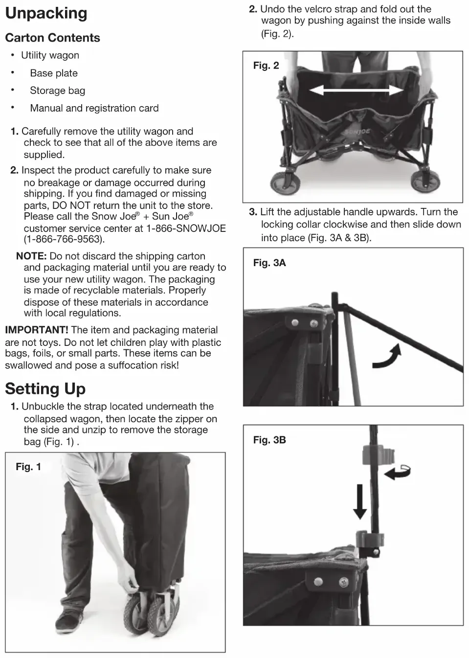 customer service center at 1-866-SNOWJOE (1-866-766-9563). NOTE: Do not discard the shipping carton and packaging material until you are ready to use your new utility wagon. The packaging is made of recyclable materials. Properly dispose of these materials in accordance with local regulations. IMPORTANT! The item and packaging material are not toys. Do not let children play with plastic bags, foils, or small parts. These items can be swallowed and pose a suocation risk! Setting Up