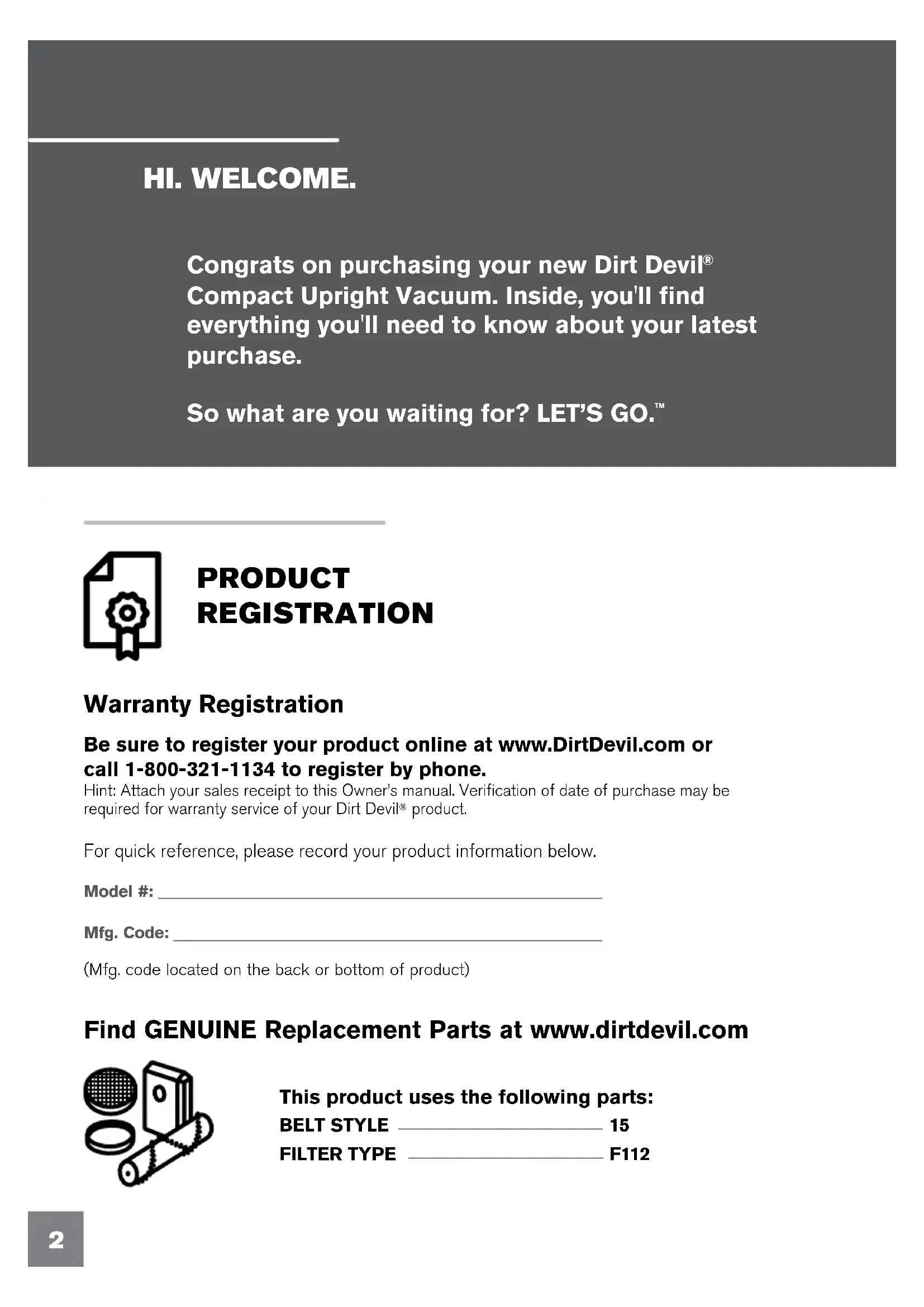 HI. WELCOME. PRODUCT REGISTRATION For quick reference, please record your product information below. Model #: Mfg. Code: (Mfg. code located on the back or bottom of product) Warranty Registration Be sure to register your product online at www.DirtDevil.com or call 1-800-321-1134 to register by phone. Hint: Attach your sales receipt to this Owner’s manual. Verification of date of purchase may be required for warranty service of your Dirt Devil