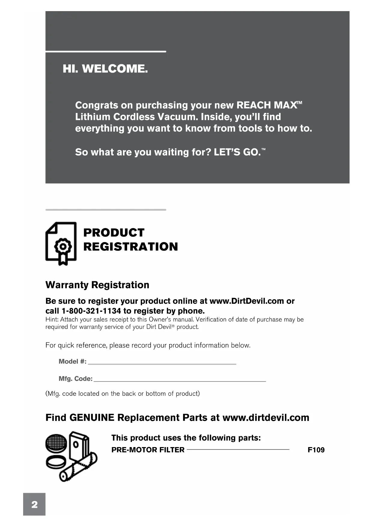 MAX TMHI. WELCOME. PRODUCT REGISTRATION For quick reference, please record your product information below. Model #: Mfg. Code: (Mfg. code located on the back or bottom of product) Warranty Registration Be sure to register your product online at www.DirtDevil.com or call 1-800-321-1134 to register by phone. Hint: Attach your sales receipt to this Owner’s manual. Verification of date of purchase may be required for warranty service of your Dirt Devil