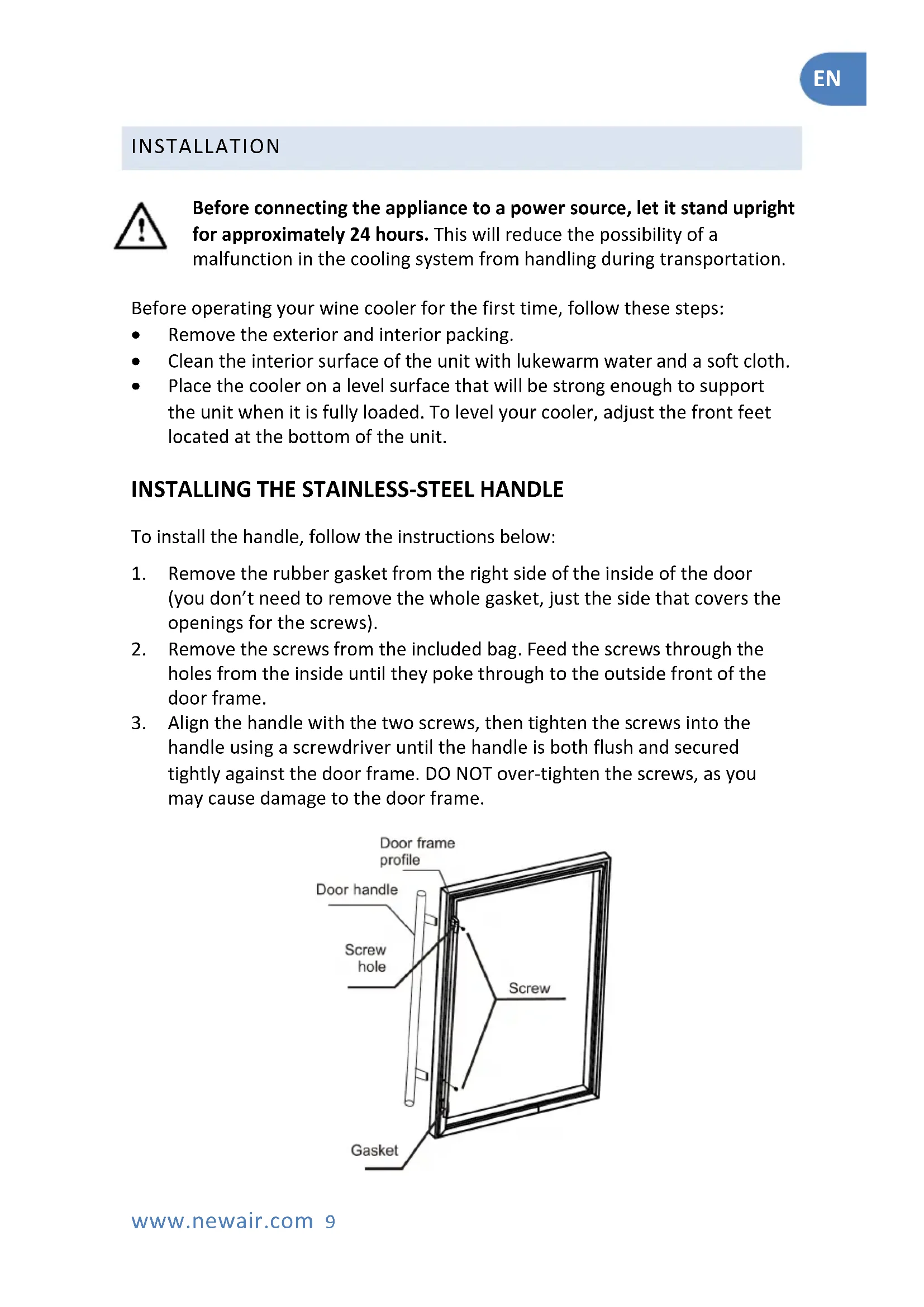 www.newair.com 9 INSTALLATION Before connecting the appliance to a power source, let it stand upright for approximately 24 hours. This will reduce the possibility of a malfunction in the cooling system from handling during transportation. Before operating your wine cooler for the first time, follow these steps: