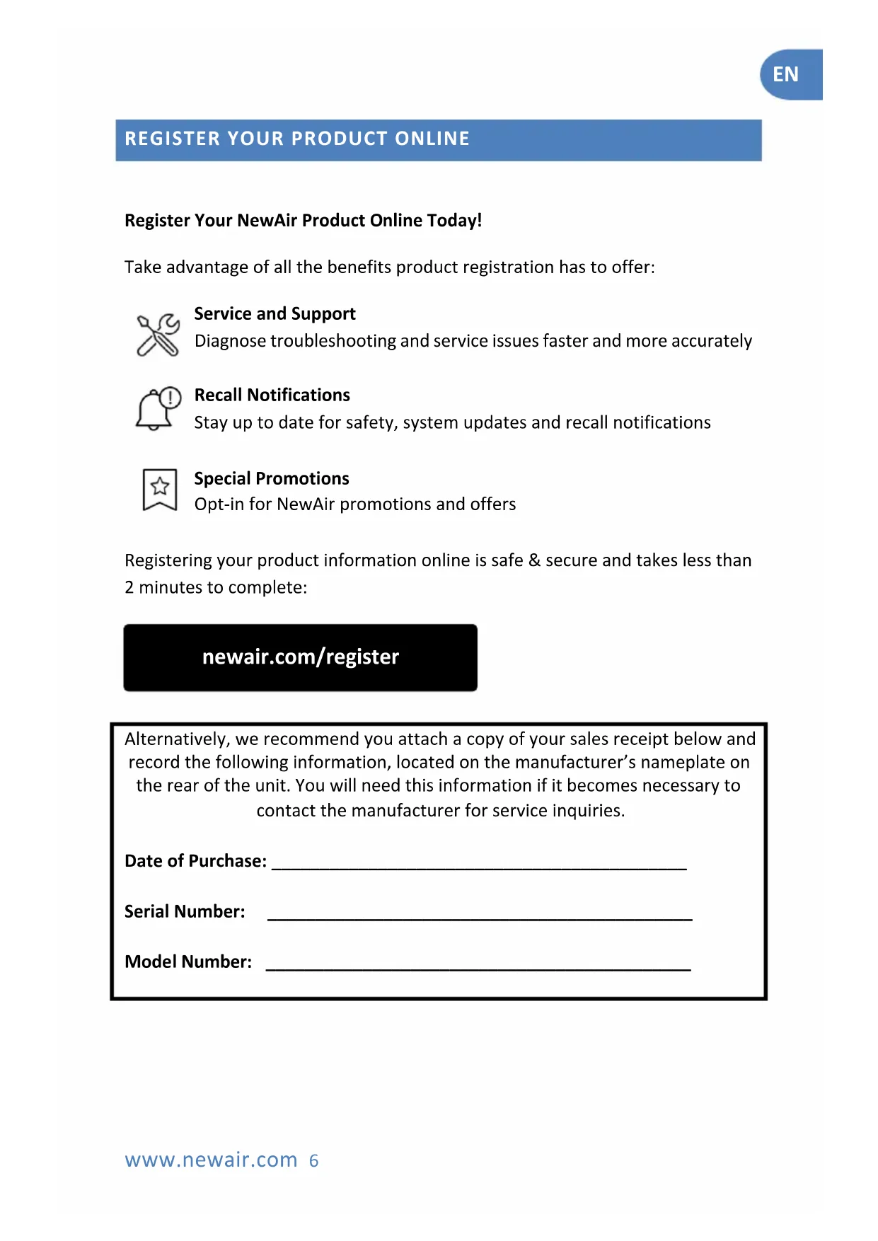 Alternatively, we recommend you attach a copy of your sales receipt below and record the following information, located on the manufacturer’s nameplate on the rear of the unit. You will need this information if it becomes necessary to contact the manufacturer for service inquiries. Date of Purchase: ___________________________________________ Serial Number: ____________________________________________ Model Number: ____________________________________________ newair.com/registerEN