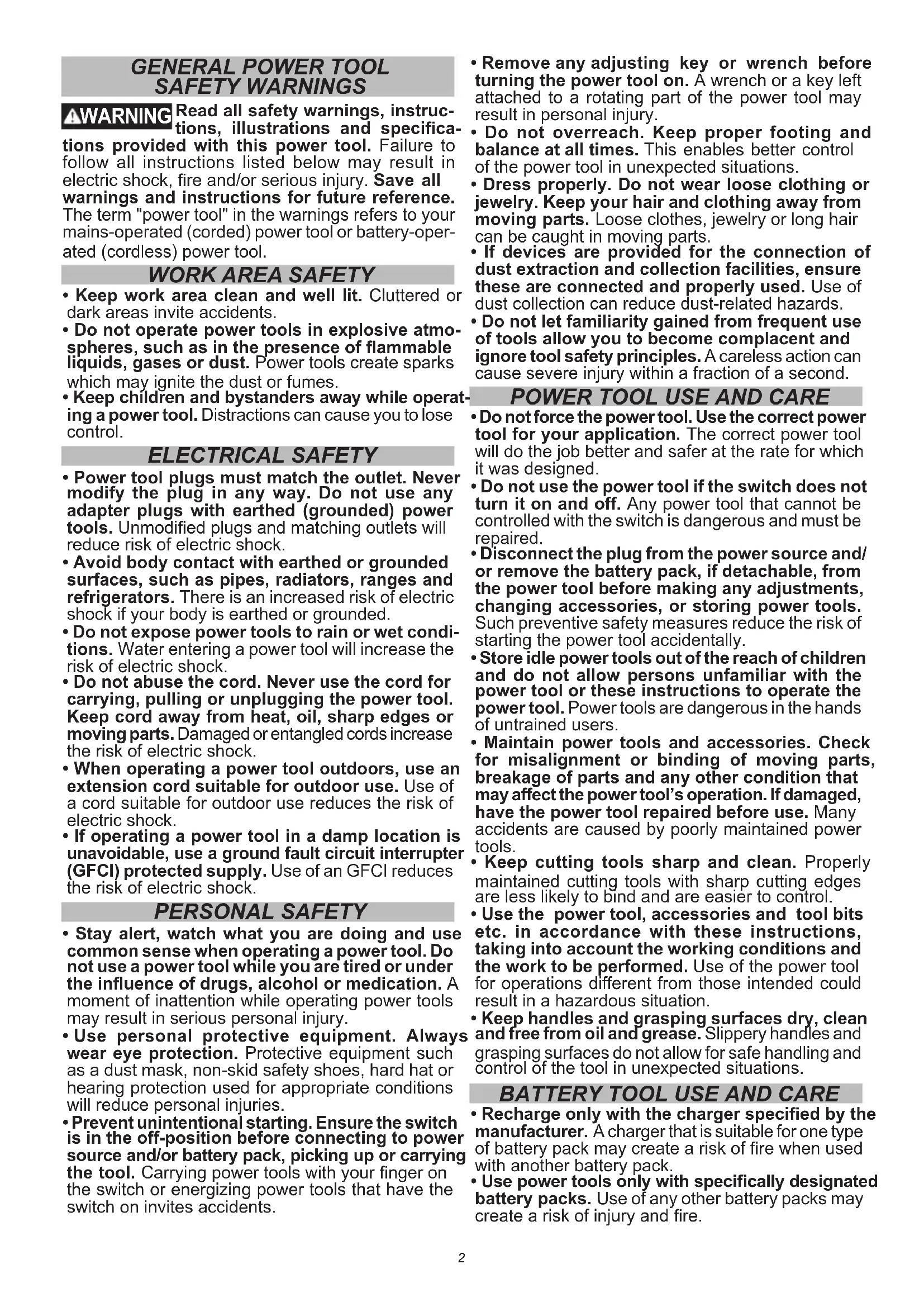 SAFETY WARNINGS WARNING Read all safety warnings, instruc- tions, illustrations and specica- tions provided with this power tool. Failure to follow all instructions listed below may result in electric shock, re and/or serious injury. Save all warnings and instructions for future reference. The term "power tool" in the warnings refers to your mains-operated (corded) power tool or battery-oper- ated (cordless) power tool.