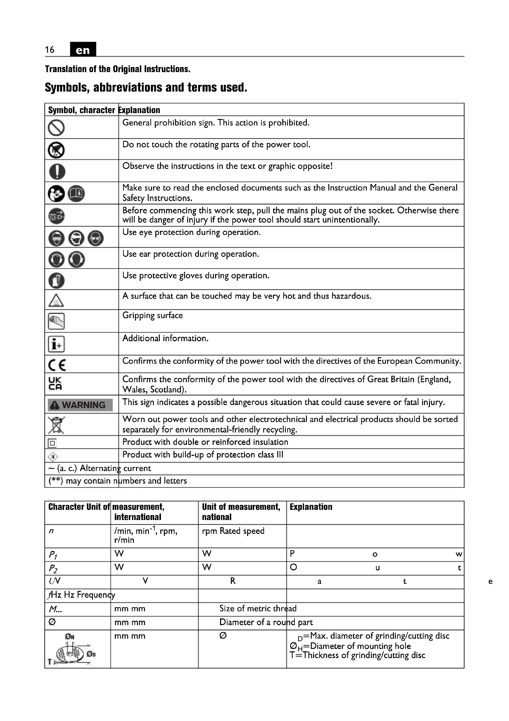 Translation of the Original Instructions. Symbols, abbreviations and terms used. Symbol, character Explanation General prohibition sign. This action is prohibited. Do not touch the rotating parts of the power tool. Observe the instructions in the text or graphic opposite! Make sure to read the enclosed documents such as the Instruction Manual and the General Safety Instructions. Before commencing this work step, pull the mains plug out of the socket. Otherwise there will be danger of injury if the power tool should start unintentionally. Use eye protection during operation. Use ear protection during operation. Use protective gloves during operation. A surface that can be touched may be very hot and thus hazardous. Gripping surface Additional information. Confirms the conformity of the power tool with the directives of the European Community. Confirms the conformity of the power tool with the directives of Great Britain (England, Wales, Scotland). This sign indicates a possible dangerous situation that could cause severe or fatal injury. Worn out power tools and other electrotechnical and electrical products should be sorted separately for environmental-friendly recycling. Product with double or reinforced insulation Product with build-up of protection class III ~ (a. c.) Alternating current (**) may contain numbers and letters WARNING Character Unit of measurement, international Unit of measurement, national Explanation