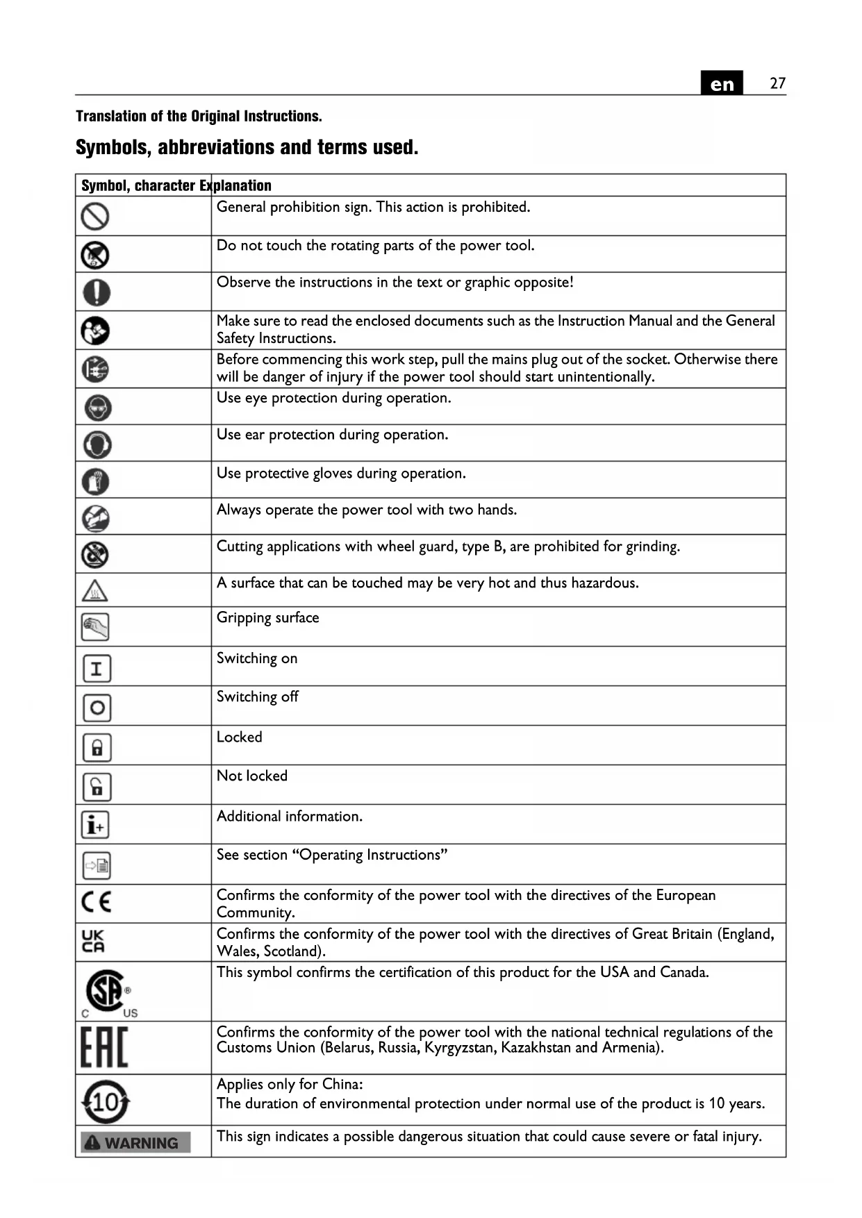 Translation of the Original Instructions. Symbols, abbreviations and terms used. Symbol, character Explanation General prohibition sign. This action is prohibited. Do not touch the rotating parts of the power tool. Observe the instructions in the text or graphic opposite! Make sure to read the enclosed documents such as the Instruction Manual and the General Safety Instructions. Before commencing this work step, pull the mains plug out of the socket. Otherwise there will be danger of injury if the power tool should start unintentionally. Use eye protection during operation. Use ear protection during operation. Use protective gloves during operation. Always operate the power tool with two hands. Cutting applications with wheel guard, type B, are prohibited for grinding. A surface that can be touched may be very hot and thus hazardous. Gripping surface Switching on Switching off Locked Not locked Additional information. See section “Operating Instructions” Confirms the conformity of the power tool with the directives of the European Community. Confirms the conformity of the power tool with the directives of Great Britain (England, Wales, Scotland). This symbol confirms the certification of this product for the USA and Canada. Confirms the conformity of the power tool with the national technical regulations of the Customs Union (Belarus, Russia, Kyrgyzstan, Kazakhstan and Armenia). Applies only for China: The duration of environmental protection under normal use of the product is 10 years. This sign indicates a possible dangerous situation that could cause severe or fatal injury. WARNING28