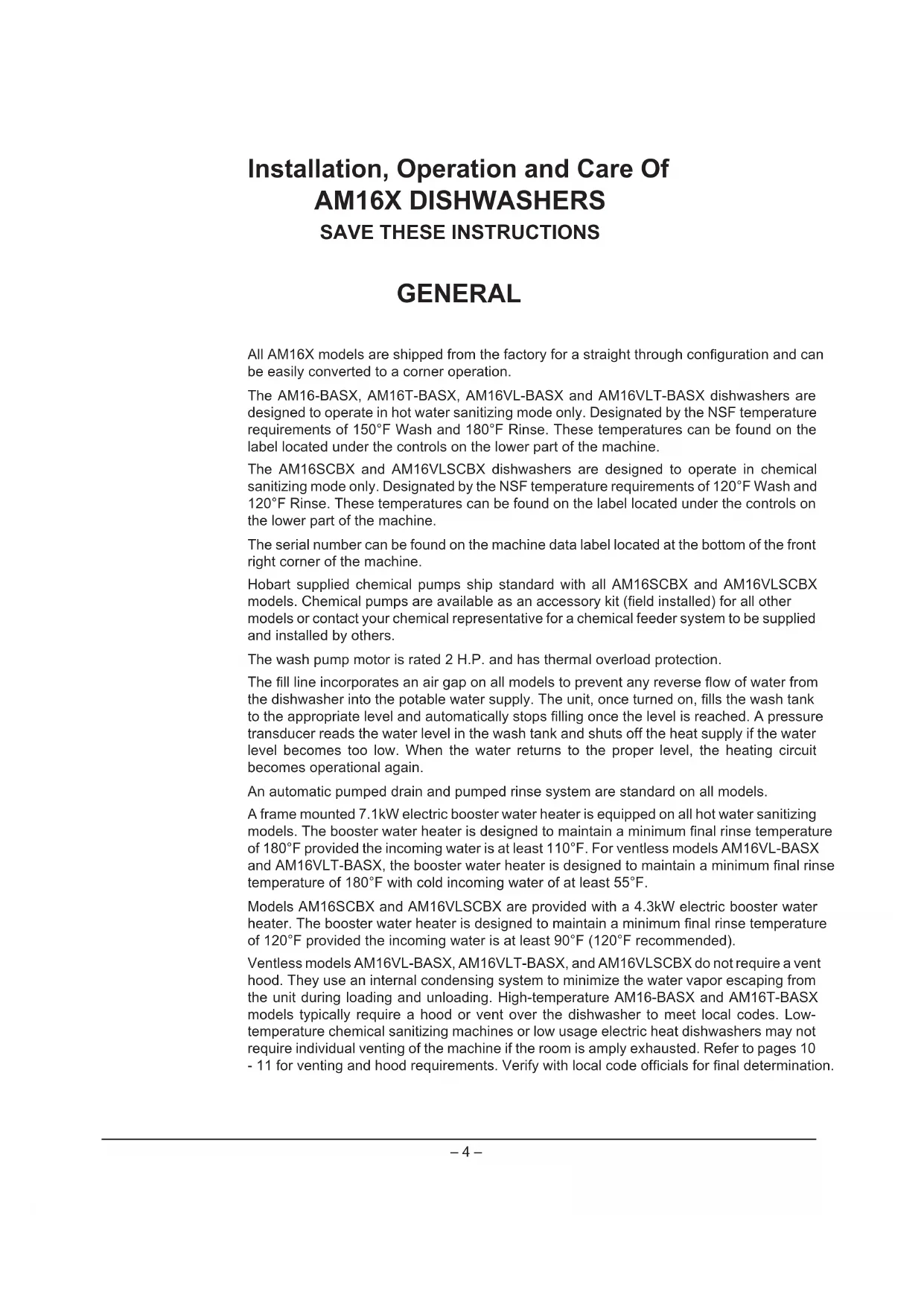 GENERAL All AM16X models are shipped from the factory for a straight through conguration and can be easily converted to a corner operation. The AM16-BASX, AM16T-BASX, AM16VL-BASX and AM16VLT-BASX dishwashers are designed to operate in hot water sanitizing mode only. Designated by the NSF temperature requirements of 150°F Wash and 180°F Rinse. These temperatures can be found on the label located under the controls on the lower part of the machine. The AM16SCBX and AM16VLSCBX dishwashers are designed to operate in chemical sanitizing mode only. Designated by the NSF temperature requirements of 120°F Wash and 120°F Rinse. These temperatures can be found on the label located under the controls on the lower part of the machine. The serial number can be found on the machine data label located at the bottom of the front right corner of the machine. Hobart supplied chemical pumps ship standard with all AM16SCBX and AM16VLSCBX models. Chemical pumps are available as an accessory kit (eld installed) for all other models or contact your chemical representative for a chemical feeder system to be supplied and installed by others. The wash pump motor is rated 2 H.P. and has thermal overload protection. The ll line incorporates an air gap on all models to prevent any reverse ow of water from the dishwasher into the potable water supply. The unit, once turned on, lls the wash tank to the appropriate level and automatically stops lling once the level is reached. A pressure transducer reads the water level in the wash tank and shuts off the heat supply if the water level becomes too low. When the water returns to the proper level, the heating circuit becomes operational again. An automatic pumped drain and pumped rinse system are standard on all models. A frame mounted 7.1kW electric booster water heater is equipped on all hot water sanitizing models. The booster water heater is designed to maintain a minimum nal rinse temperature of 180°F provided the incoming water is at least 110°F. For ventless models AM16VL-BASX and AM16VLT-BASX, the booster water heater is designed to maintain a minimum nal rinse temperature of 180°F with cold incoming water of at least 55°F. Models AM16SCBX and AM16VLSCBX are provided with a 4.3kW electric booster water heater. The booster water heater is designed to maintain a minimum nal rinse temperature of 120°F provided the incoming water is at least 90°F (120°F recommended). Ventless models AM16VL-BASX, AM16VLT-BASX, and AM16VLSCBX do not require a vent hood. They use an internal condensing system to minimize the water vapor escaping from the unit during loading and unloading. High-temperature AM16-BASX and AM16T-BASX models typically require a hood or vent over the dishwasher to meet local codes. Low- temperature chemical sanitizing machines or low usage electric heat dishwashers may not require individual venting of the machine if the room is amply exhausted. Refer to pages 10 - 11 for venting and hood requirements. Verify with local code ofcials for nal determination.– 5 – INSTALLATION UNPACKING Immediately after unpacking the dishwasher, check for possible shipping damage. If this machine is found to be damaged, save the packaging material and contact the carrier within 5 days of delivery. NOTE: Use caution when using a forklift to remove machine from skid. DO NOT use door lift handle to move machine, as it will cause door lift issues. Prior to installation, test the electrical service to ensure it agrees with the specications on the machine data plate. The dishwasher data plate is located at the lower right hand corner of the machine. INSTALLATION CODES Installation must be in accordance with state and local codes and the National Electrical Code ANSI/NFPA70 (latest edition). In Canada, the installation code is CSA 22.1 (latest edition). LOCATION Before nalizing the location, make sure that consideration has been given for the electrical conduit, water supply, drain connection, venting (if applicable), tabling (if needed), chemical feeder replenishment (if applicable) and adequate clearance for opening the door. The dishwasher must be level before any connections are made. Turn the threaded feet (Fig. 1) as required to level the machine and adjust to the desired height. The edge of dish table that overhangs the AM16 wash tank should be turned down and tted over the top of the dishwasher tank (Fig. 2). Apply an NSF approved sealant between the overhang of the dish table and the inner wall of the wash tank to prevent leakage (Fig. 2). Fasten the dish tables to the inner wall of the wash tank with non-rusting truss head screws or rivets (Fig. 2). For straight-through installations, 30" clearance at the front and 20" clearance at the right side by 29-1/2" clearance above the nished oor must be provided for service. NOTE: For 480-volt units, 20" clearance required at left side. Fig. 1 Fig. 2 MACHINE LEG ADJUSTABLE FOOT