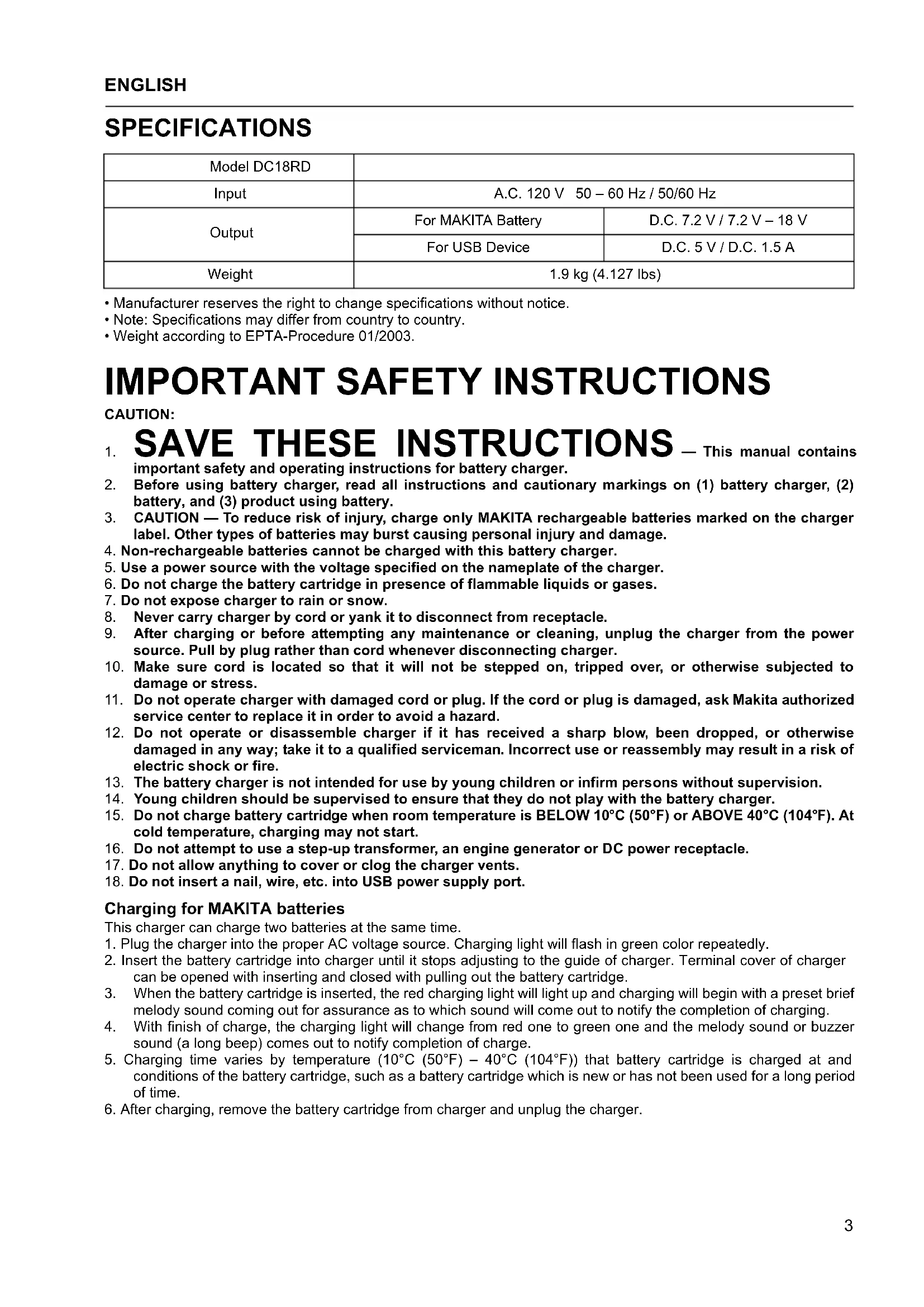 Model DC18RD Input A.C. 120 V 50 – 60 Hz / 50/60 Hz Output For MAKITA Battery D.C. 7.2 V / 7.2 V – 18 V For USB Device D.C. 5 V / D.C. 1.5 A Weight 1.9 kg (4.127 lbs)4 Changing melody sound of completed charging