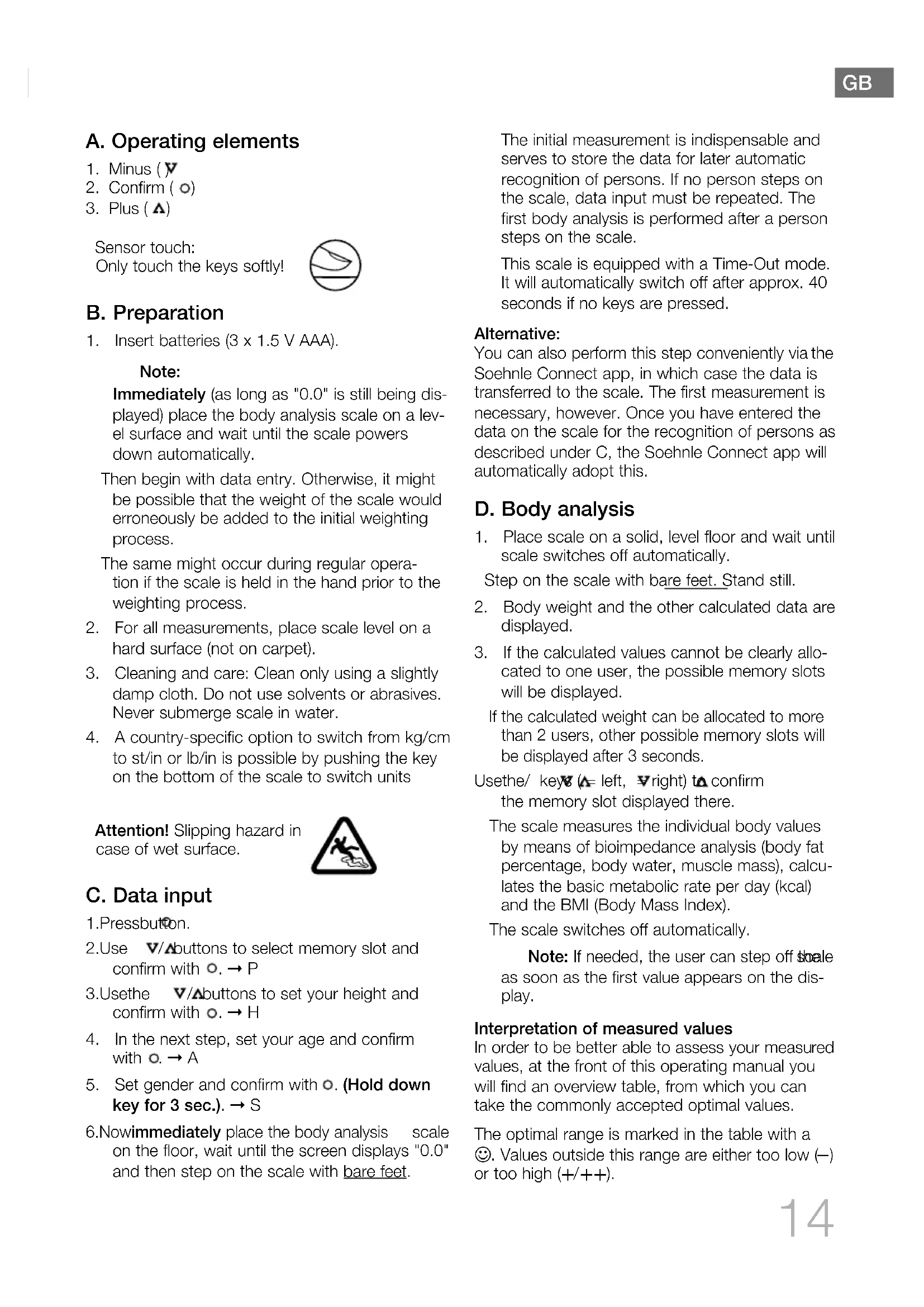scale on the floor, wait until the screen displays "0.0" and then step on the scale with bare feet. The initial measurement is indispensable and serves to store the data for later automatic recognition of persons. If no person steps on the scale, data input must be repeated. The first body analysis is performed after a person steps on the scale. This scale is equipped with a Time-Out mode. It will automatically switch off after approx. 40 seconds if no keys are pressed. Alternative: You can also perform this step conveniently via the Soehnle Connect app, in which case the data is transferred to the scale. The first measurement is necessary, however. Once you have entered the data on the scale for the recognition of persons as described under C, the Soehnle Connect app will automatically adopt this. D. Body analysis
