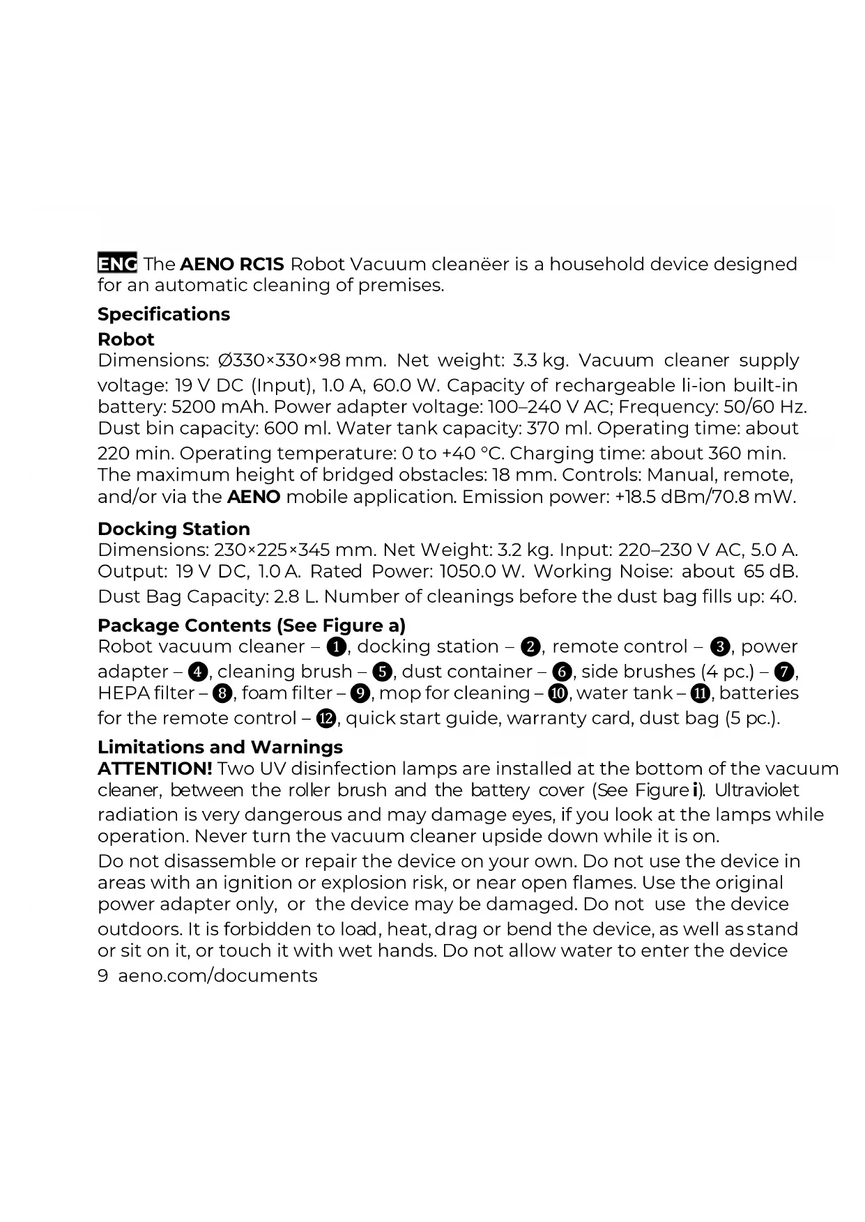 i)9 aeno.com/documents ENG The AENO RC1S Robot Vacuum cleanёer is a household device designed for an automatic cleaning of premises. Specifications Robot Dimensions: Ø330×330×98 mm. Net weight: 3.3 kg. Vacuum cleaner supply voltage: 19 V DC (Input), 1.0 A, 60.0 W. Capacity of rechargeable li-ion built-in battery: 5200 mAh. Power adapter voltage: 100–240 V AC; Frequency: 50/60 Hz. Dust bin capacity: 600 ml. Water tank capacity: 370 ml. Operating time: about 220 min. Operating temperature: 0 to +40 °C. Charging time: about 360 min. The maximum height of bridged obstacles: 18 mm. Controls: Manual, remote, and/or via the AENO mobile application. Emission power: +18.5 dBm/70.8 mW. Docking Station Dimensions: 230×225×345 mm. Net Weight: 3.2 kg. Input: 220–230 V AC, 5.0 A. Output: 19 V DC, 1.0 A. Rated Power: 1050.0 W. Working Noise: about 65 dB. Dust Bag Capacity: 2.8 L. Number of cleanings before the dust bag fills up: 40. Package Contents (See Figure a) Robot vacuum cleaner – ❶, docking station – ❷, remote control – ❸, power adapter – ❹, cleaning brush – ❺, dust container – ❻, side brushes (4 pc.) – ❼, HEPA filter – ❽, foam filter – ❾, mop for cleaning – ❿, water tank – ⓫, batteries for the remote control – ⓬, quick start guide, warranty card, dust bag (5 pc.). Limitations and Warnings ATTENTION! Two UV disinfection lamps are installed at the bottom of the vacuum cleaner, between the roller brush and the battery cover (See Figure i). Ultraviolet radiation is very dangerous and may damage eyes, if you look at the lamps while operation. Never turn the vacuum cleaner upside down while it is on. Do not disassemble or repair the device on your own. Do not use the device in areas with an ignition or explosion risk, or near open flames. Use the original power adapter only, or the device may be damaged. Do not use the device outdoors. It is forbidden to load, heat, drag or bend the device, as well as stand or sit on it, or touch it with wet hands. Do not allow water to enter the deviceaeno.com/documents 10 body, and do not use the device in wet areas such as bathrooms. Do not place the device in areas where it can easily fall (Tables, chairs, stairs, high platforms, etc.). Before dry mopping, make sure to install the dust container ❻. Please note that bright and direct sunlight, as well as very dark surfaces influence operation of infrared sensors of the vacuum cleaner. For example, dark surfaces are taken as obstacles. So, it is recommended not to leave dark carpets or fabrics on the floor, and cover windows with curtains on a sunny day. Before operating the device, you should remove all sensitive or potentially dangerous objects from the floor such as glass, lamps, wires, curtains, valuables and jewelry, hairpins, debris, etc. The vacuum cleaner is able to bridge obstacles up to 18mm high. Please take care of children and the elderly when cleaning in order to avoid injury. If the body of the vacuum cleaner becomes too hot during charging, you should stop charging. Do not use the vacuum cleaner battery to recharge other devices. Do not close contacts or disassemble the battery. Turn off the power to the device, if it’s not operated for a long time. The device will operate on a schedule, if it is always turned on and charged. Charging Before Initial Setup The device shall be initially charged for at least 12 hours. The following two options for charging are available: