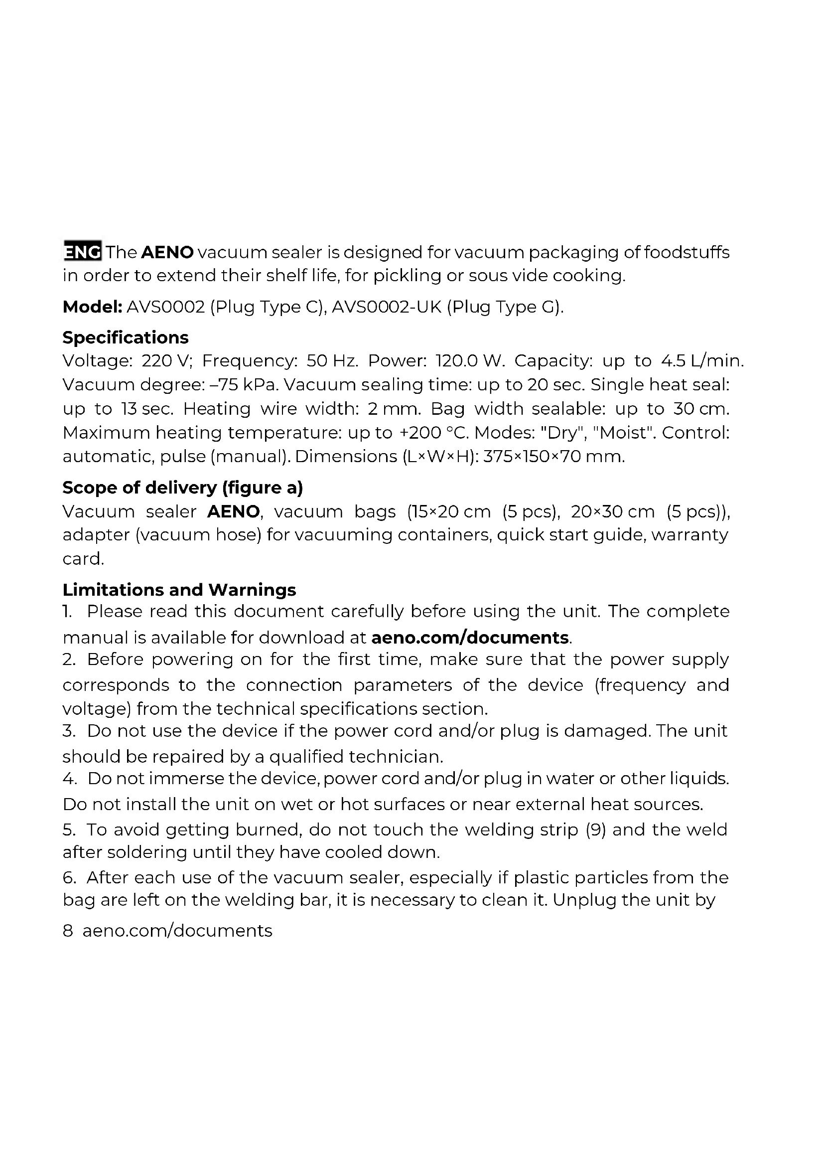 ZHO…………………………………………………………………………………………………………………………………… 1264 aeno.com/documents a)aeno.com/documents 5 a)6 aeno.com/documents b)aeno.com/documents 7 c)8 aeno.com/documents ENG The AENO vacuum sealer is designed for vacuum packaging of foodstuffs in order to extend their shelf life, for pickling or sous vide cooking. Model: AVS0002 (Plug Type C), AVS0002-UK (Plug Type G). Specifications Voltage: 220 V; Frequency: 50 Hz. Power: 120.0 W. Capacity: up to 4.5 L/min. Vacuum degree: –75 kPa. Vacuum sealing time: up to 20 sec. Single heat seal: up to 13 sec. Heating wire width: 2 mm. Bag width sealable: up to 30 cm. Maximum heating temperature: up to +200 °C. Modes: "Dry", "Moist". Control: automatic, pulse (manual). Dimensions (L×W×H): 375×150×70 mm. Scope of delivery (figure a) Vacuum sealer AENO, vacuum bags (15×20 cm (5 pcs), 20×30 cm (5 pcs)), adapter (vacuum hose) for vacuuming containers, quick start guide, warranty card. Limitations and Warnings