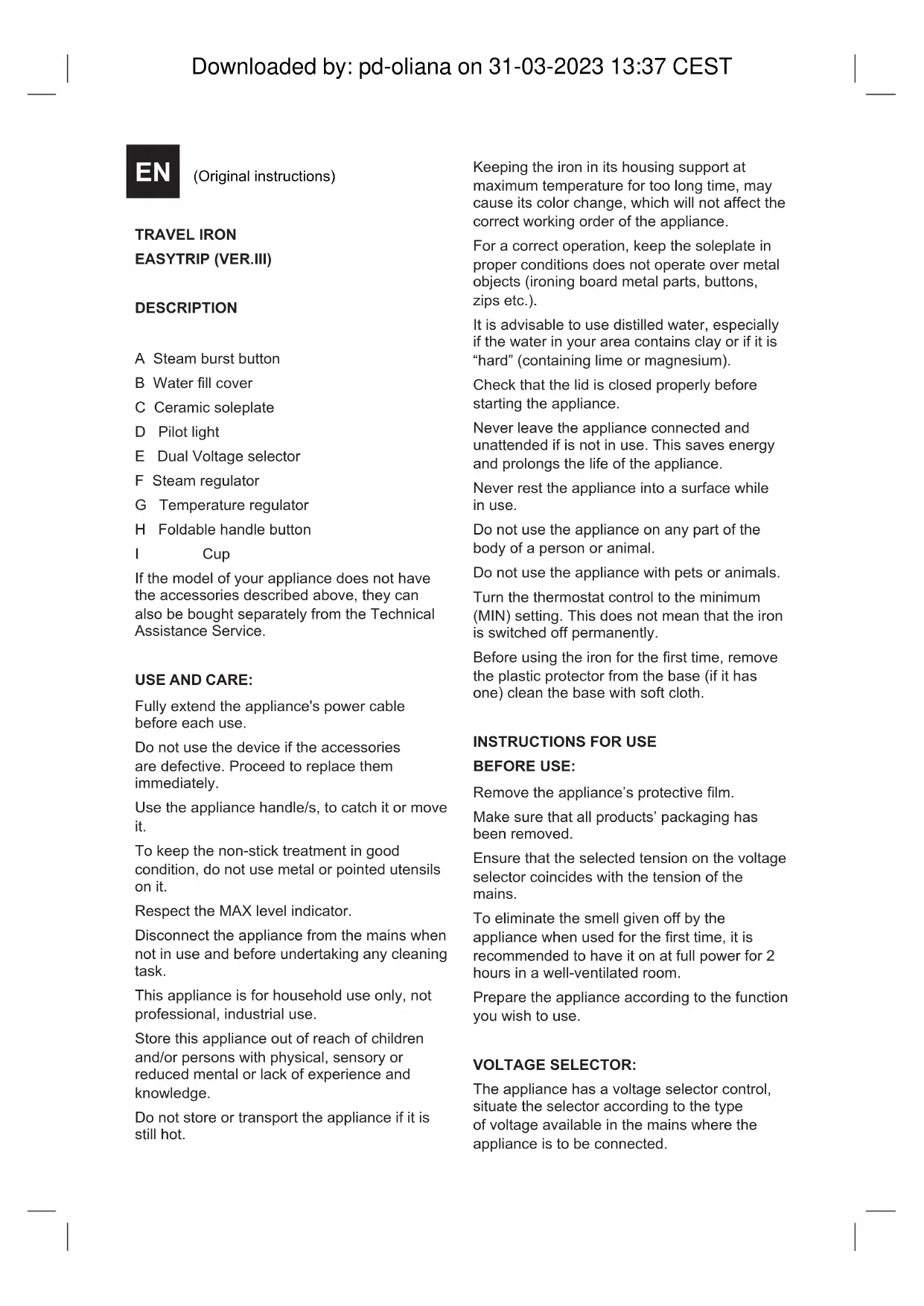 CALCÁREAS: Para un perfecto funcionamiento del aparato, éste deberá estar libre de incrustaciones de cal o magnesio, originadas por el uso de aguas de alta dureza. Para evitar este tipo de problema se recomienda el uso de agua destilada o agua puricada. En todo caso, si no es posible el uso del tipo de agua recomendado anteriormente, deberá proceder periódicamente a un tratamiento de descalcicación del aparato, con una periodicidad de: Cada 6 semanas si el agua es “muy dura”. Cada 12 semanas si el agua es “dura”. Para ello recomendamos el uso de un producto especíco para este tipo de aparato, de venta en tiendas especializadas y servicios técnicos autorizados. Downloaded by: pd-oliana on 31-03-2023 13:37 CESTTRAVEL IRON EASYTRIP (VER.III) DESCRIPTION A Steam burst button B Water ll cover C Ceramic soleplate D Pilot light E Dual Voltage selector F Steam regulator G Temperature regulator H Foldable handle button I Cup If the model of your appliance does not have the accessories described above, they can also be bought separately from the Technical Assistance Service. USE AND CARE: Fully extend the appliance's power cable before each use. Do not use the device if the accessories are defective. Proceed to replace them immediately. Use the appliance handle/s, to catch it or move it. To keep the non-stick treatment in good condition, do not use metal or pointed utensils on it. Respect the MAX level indicator. Disconnect the appliance from the mains when not in use and before undertaking any cleaning task. This appliance is for household use only, not professional, industrial use. Store this appliance out of reach of children and/or persons with physical, sensory or reduced mental or lack of experience and knowledge. Do not store or transport the appliance if it is still hot. Keeping the iron in its housing support at maximum temperature for too long time, may cause its color change, which will not affect the correct working order of the appliance. For a correct operation, keep the soleplate in proper conditions does not operate over metal objects (ironing board metal parts, buttons, zips etc.). It is advisable to use distilled water, especially if the water in your area contains clay or if it is “hard” (containing lime or magnesium). Check that the lid is closed properly before starting the appliance. Never leave the appliance connected and unattended if is not in use. This saves energy and prolongs the life of the appliance. Never rest the appliance into a surface while in use. Do not use the appliance on any part of the body of a person or animal. Do not use the appliance with pets or animals. Turn the thermostat control to the minimum (MIN) setting. This does not mean that the iron is switched off permanently. Before using the iron for the rst time, remove the plastic protector from the base (if it has one) clean the base with soft cloth.